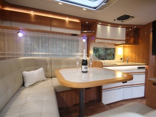 Voldoende plaats om te ontspannen vindt u in de gezellige rondzitgroep achterin, volledig met leer bekleed en van alle luxe voorzien. De grote panoramische ramen bieden u een prachtig uitzicht. De slim geïntegreerde hangkasten, laden en opbergvakken in de dubbele bodem bieden u talloze opbergmogelijkheden.