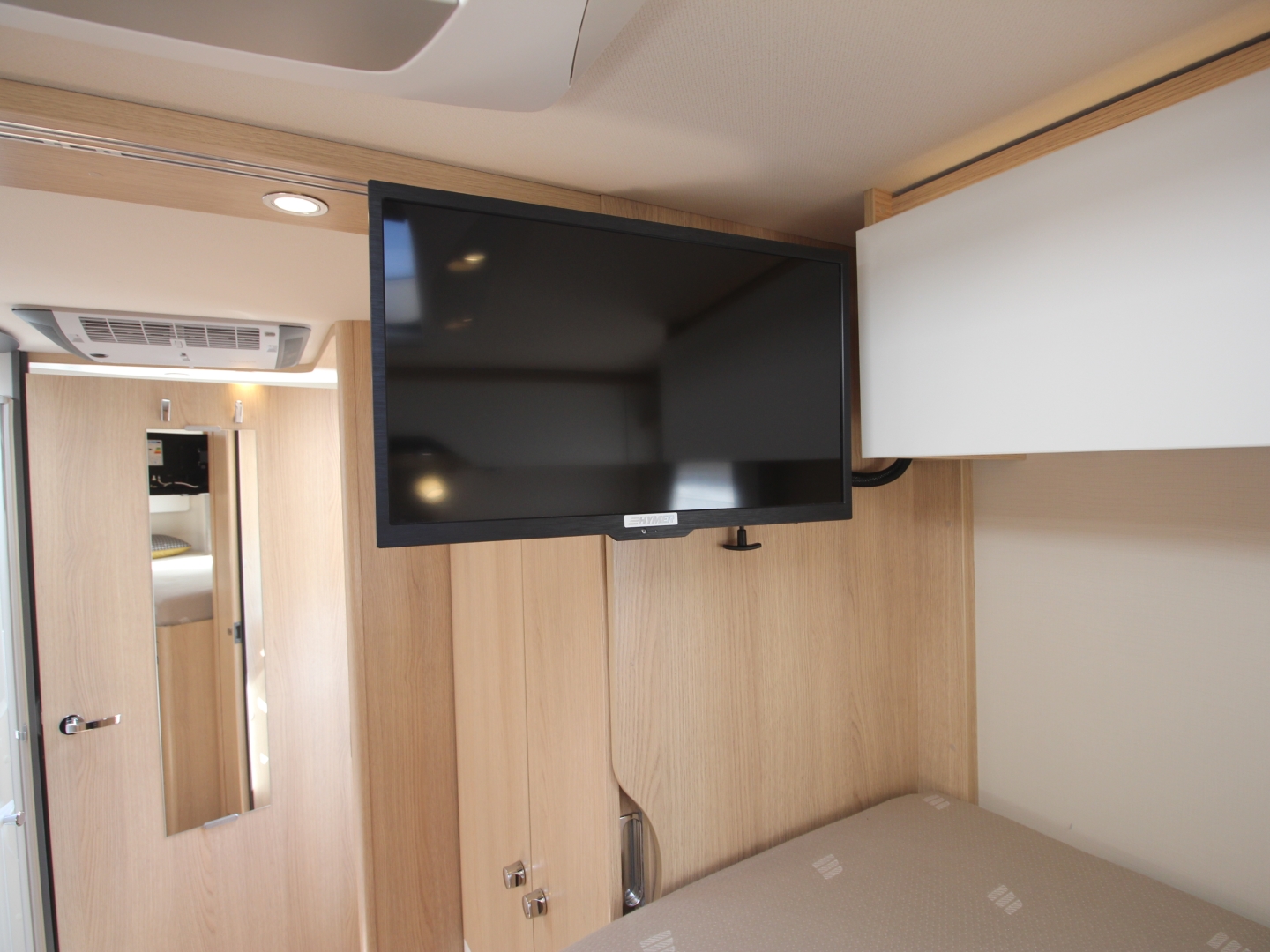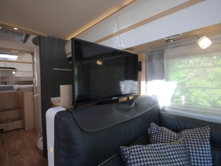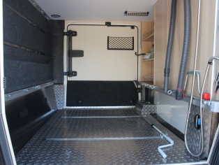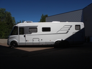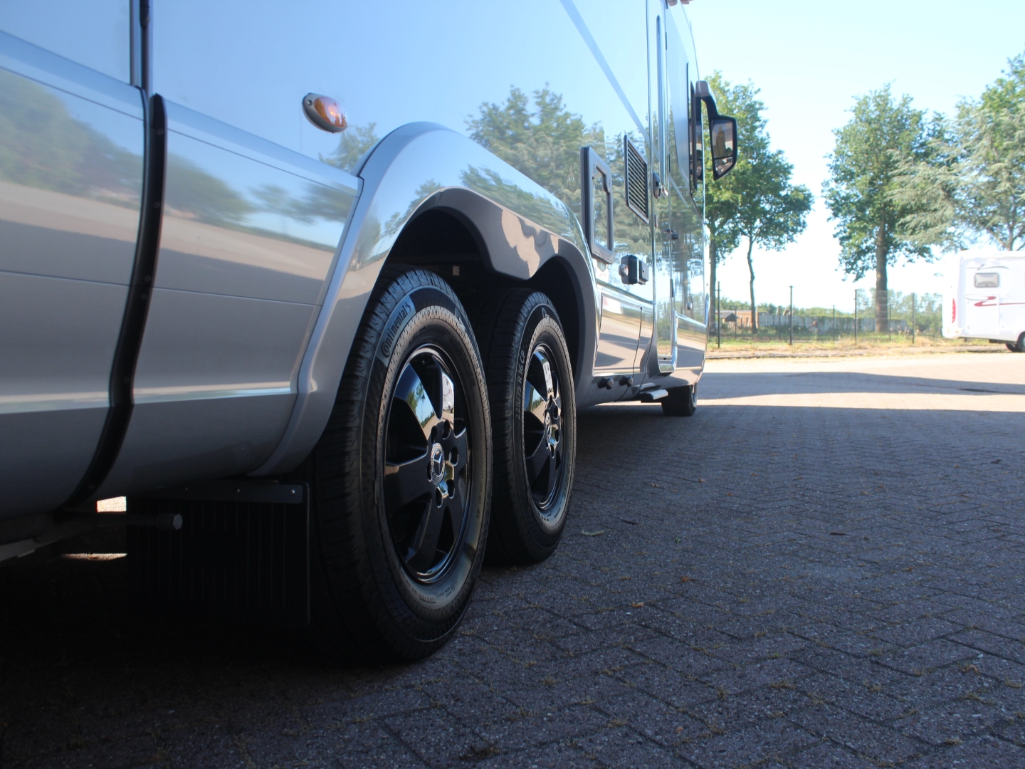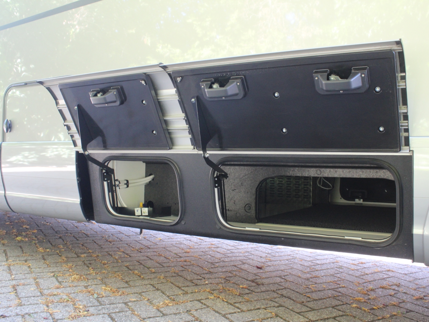 De camper heeft veel bergruimte in de ruime dubbele bodem bereikbaar dmv. verschillende luiken in de vloer en diverse kleppen buitenkant. Het bevat tevens een grote garage, met aan beide zijden een grote deur, waarin uw fietsen en bagage veilig binnen geplaatst kunnen worden. De 180 ltr schoon- en 150 ltr vuilwatertank bevinden zich in de (verwarmde) dubbele vloer.
