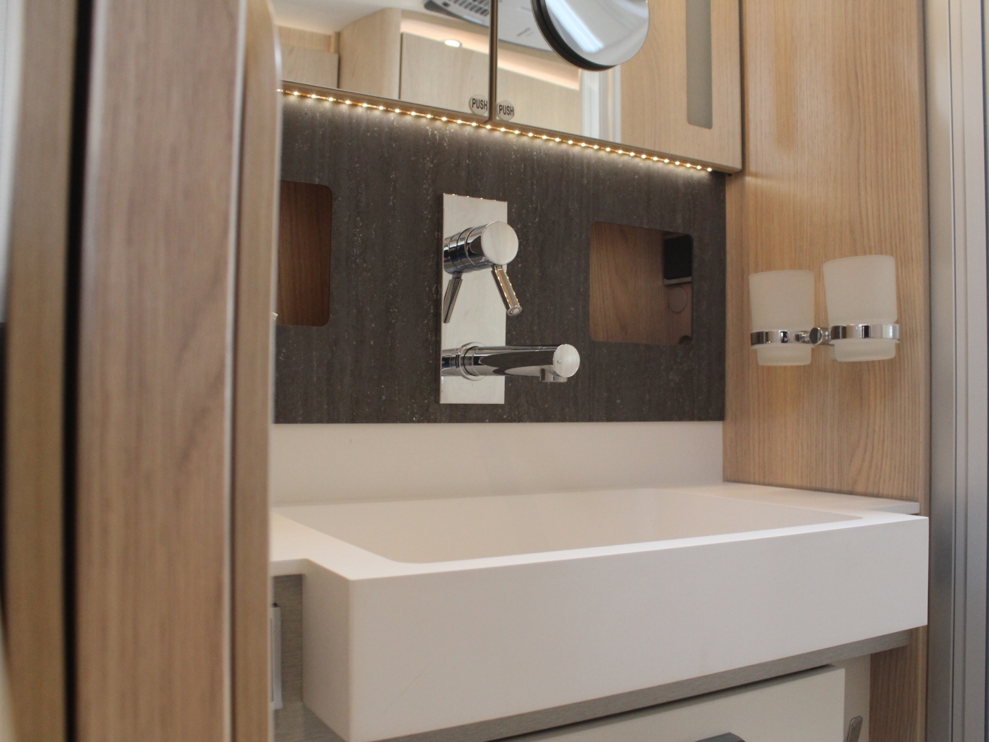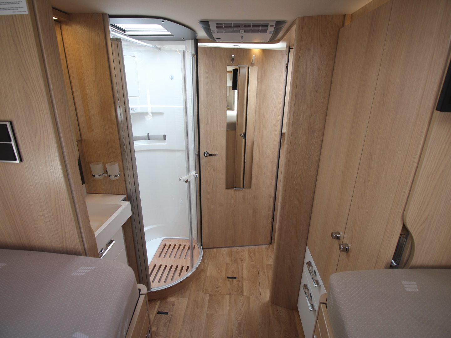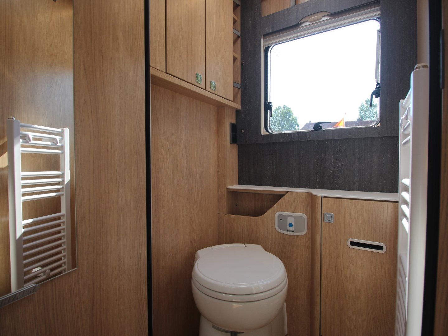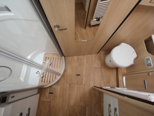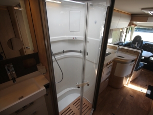 Links achterin bevind zich de ruime douchecabine, en er tegenover het toilet Thetford met SOG automatische toilet ontluchting en extra kastruimte.
