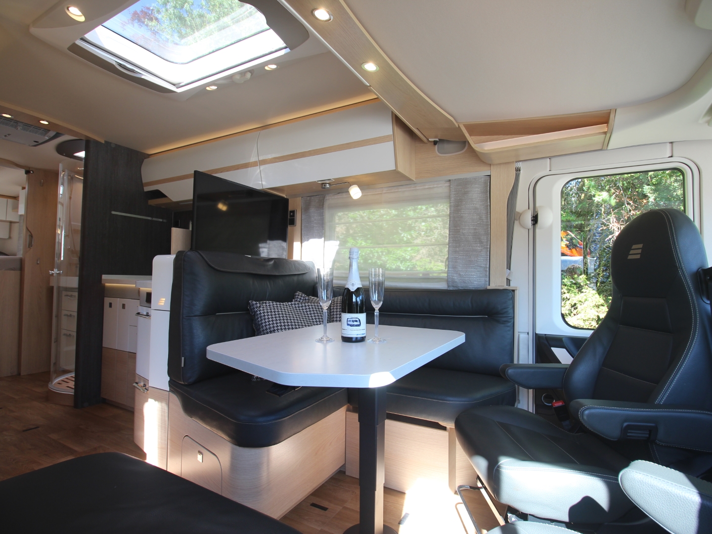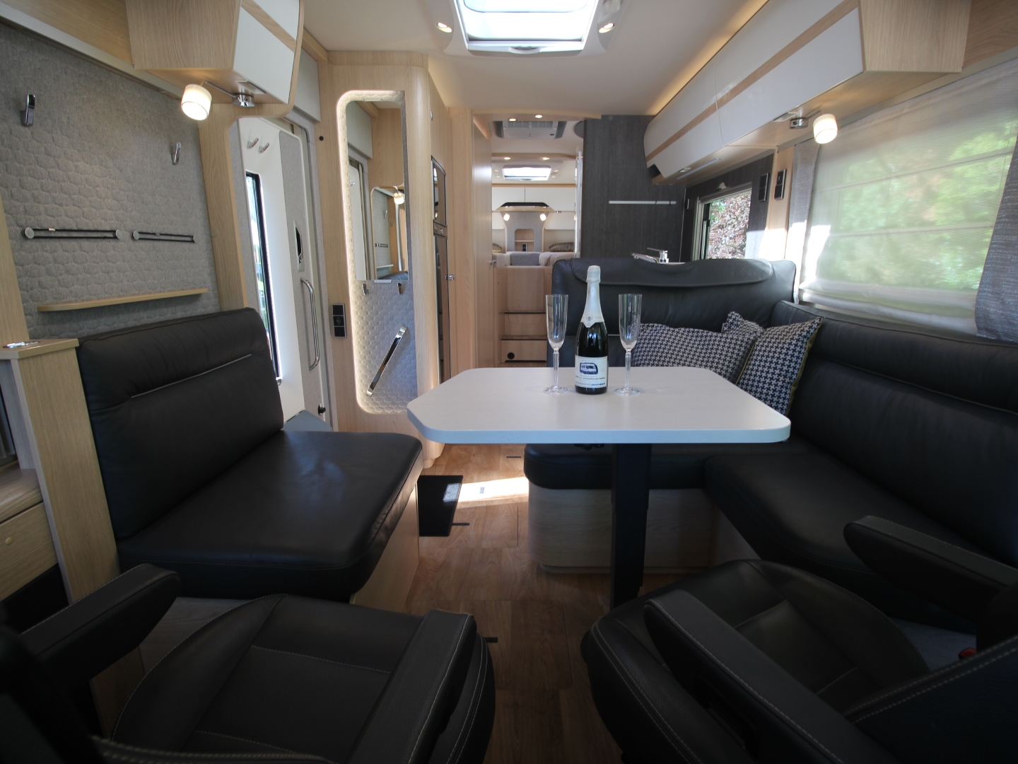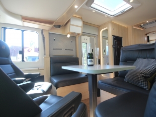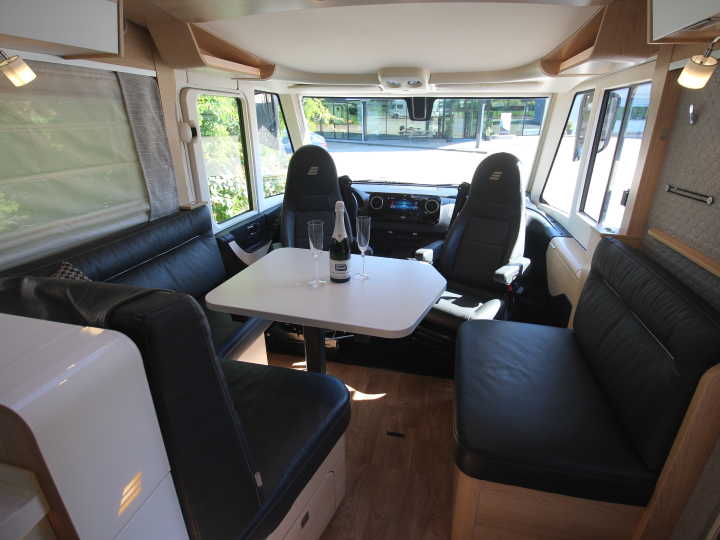 2 comfortabele, met leer beklede, Aguti Ergoflex pilotenstoelen in hoogte verstelbaar en kantelbaar, draaibaar naar een gezellige comfort L-zit met luxe uitschuifbare salontafel. Het interieur bestaat uit het moderne meubeldesign Grand Oak met de luxe lederen bekleding wat in combinatie met de vele (indirecte) LED verlichting een bijzondere sfeer geeft. Het geheel word verwarmd door het comfortabele ALDE 3020 HE vloeistof-verwarming. Cabineramen zijn voorzien van vouw- verduistering van hoogwaardig plisséstof. Het voorraam word verduistert dmv. een elektrisch rolluik.