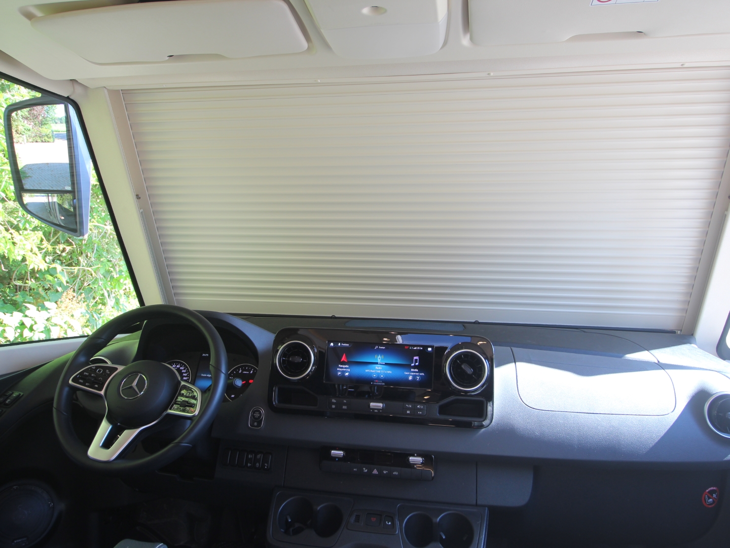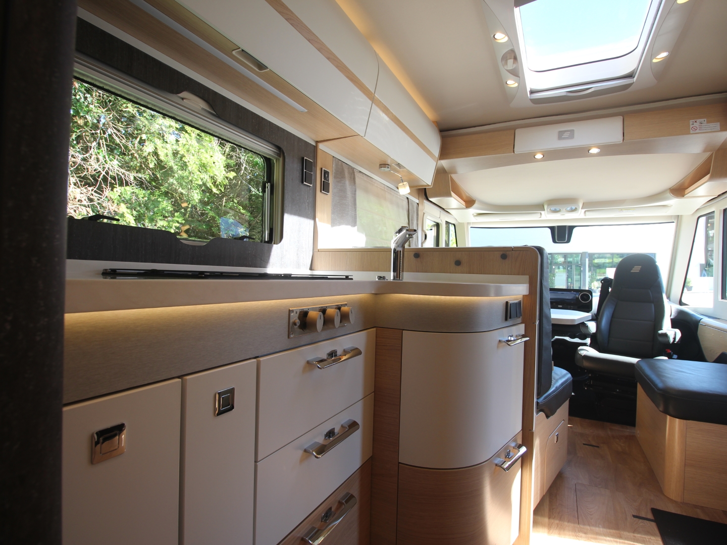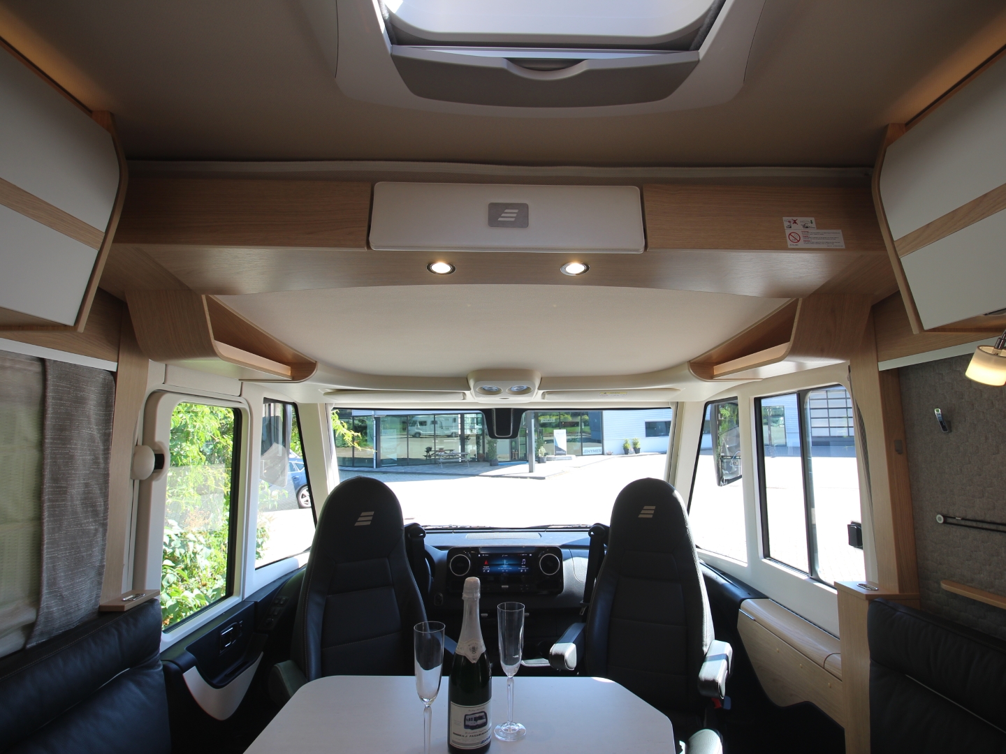 2 comfortabele, met leer beklede, Aguti Ergoflex pilotenstoelen in hoogte verstelbaar en kantelbaar, draaibaar naar een gezellige comfort L-zit met luxe uitschuifbare salontafel. Het interieur bestaat uit het moderne meubeldesign Grand Oak met de luxe lederen bekleding wat in combinatie met de vele (indirecte) LED verlichting een bijzondere sfeer geeft. Het geheel word verwarmd door het comfortabele ALDE 3020 HE vloeistof-verwarming. Cabineramen zijn voorzien van vouw- verduistering van hoogwaardig plisséstof. Het voorraam word verduistert dmv. een elektrisch rolluik.
