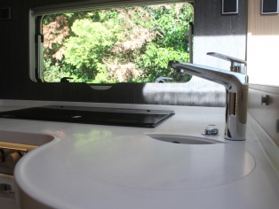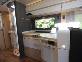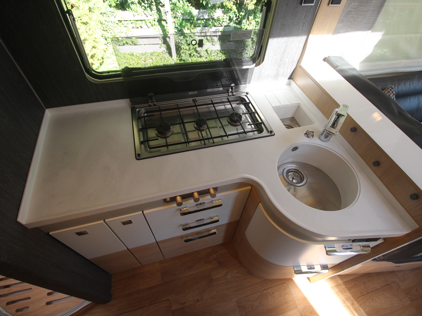 De royale keuken heeft een luxe keukenblad met spoelbak en 3 pits kooktoestel met automatische ontsteking, diverse gelagerde laden met verrassend veel bergruimte voor het kookgerei en boodschappen, grote koelkast 140 ltr met aparte vriezer en automatische energiekeuze.