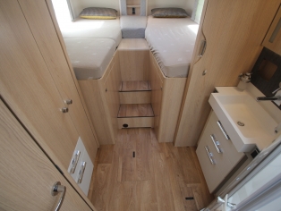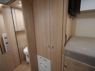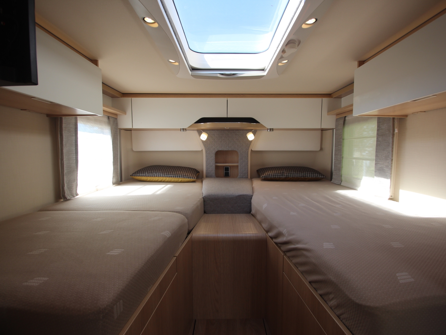 De slaapkamer achter heeft twee enkele bedden, (dicht te leggen naar eén groot bed) met het Hymer slaapcomfort schotelsysteem. Door de tussendeur te sluiten ontstaat er een ruime slaapkamer met sanitaire voorzieningen met veel privacy. Bovenin de cabine is een royaal 2 persoons hefbed, terwijl van de zitgroep ook nog een extra bed gemaakt kan worden.
