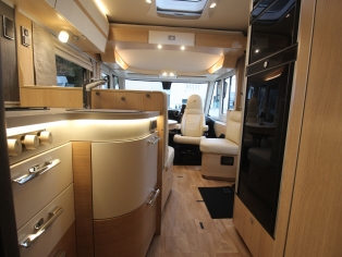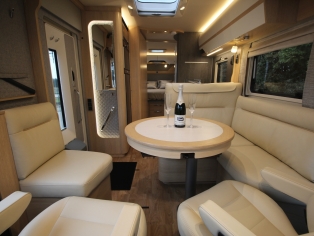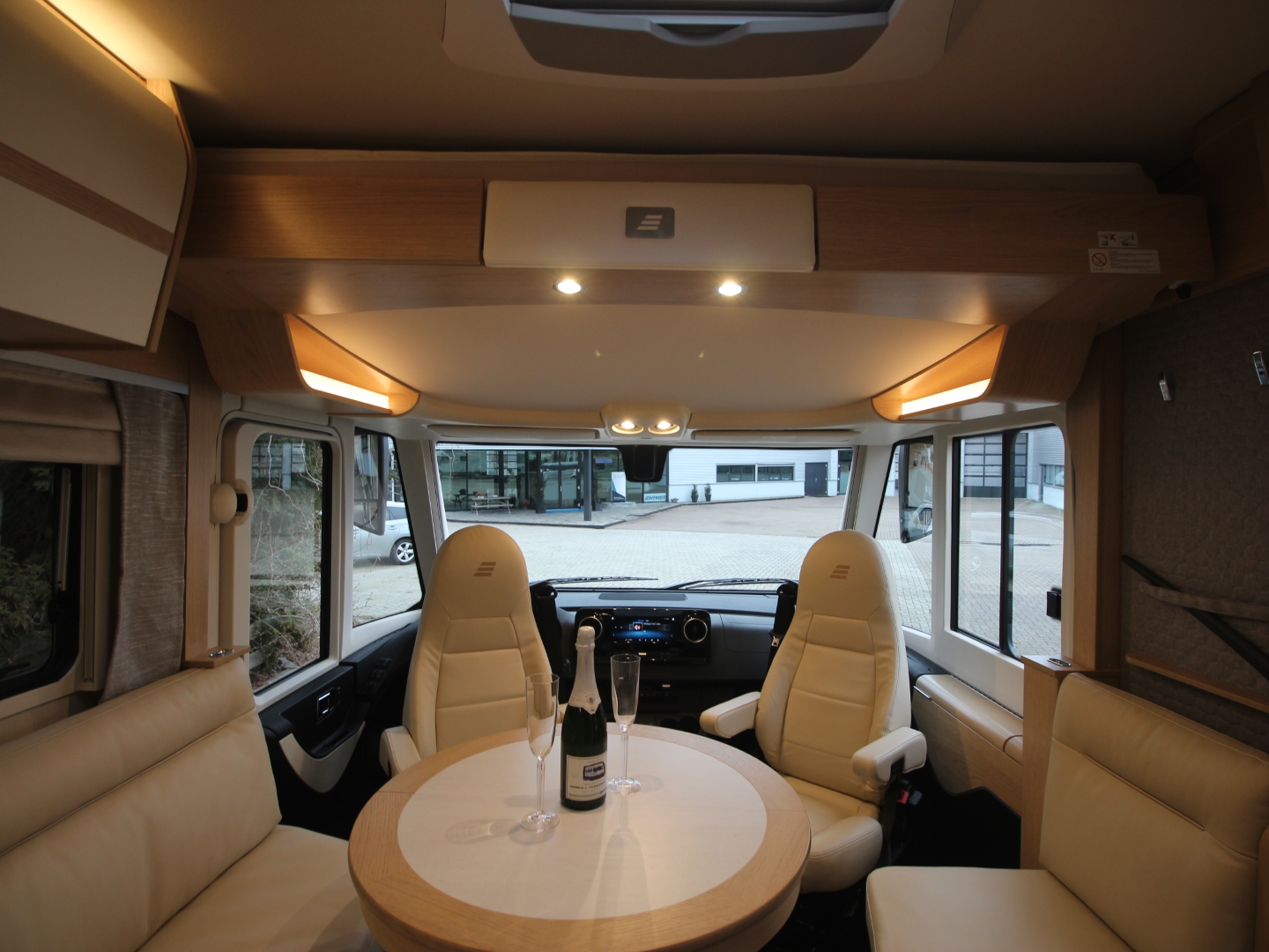 2 comfortabele, met leer beklede, Aguti Ergoflex pilotenstoelen in hoogte verstelbaar en kantelbaar, draaibaar naar een gezellige comfort L-zit met luxe uitschuifbare salontafel. Het interieur bestaat uit het moderne meubeldesign Grand Oak met de luxe lederen bekleding wat in combinatie met de vele (indirecte) LED verlichting een bijzondere sfeer geeft. Het geheel word verwarmd door het comfortabele ALDE 3020 HE vloeistof-verwarming. Cabineramen zijn voorzien van vouw- verduistering van hoogwaardig plisséstof. Het voorraam word verduistert dmv. een elektrisch rolluik.