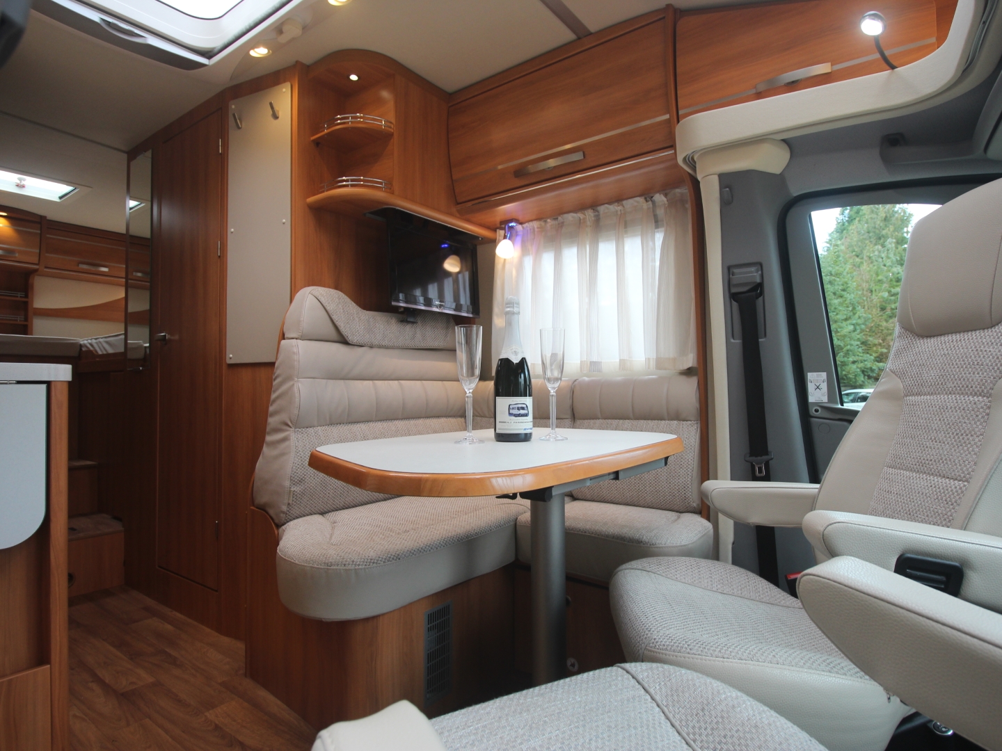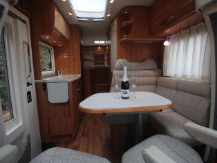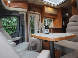 2 comfortabele pilotestoelen in hoogte verstelbaar, draaibaar naar een gezellige comfort L-zit met luxe salontafel en groot panoramadak er boven.