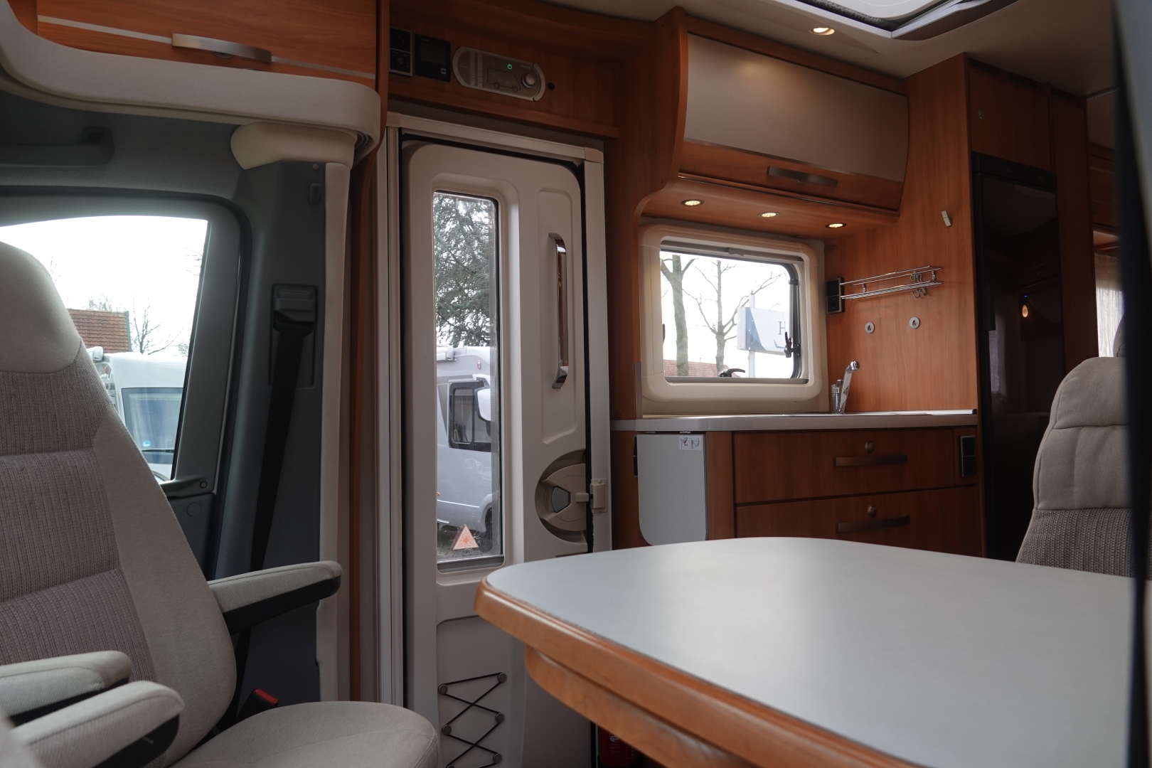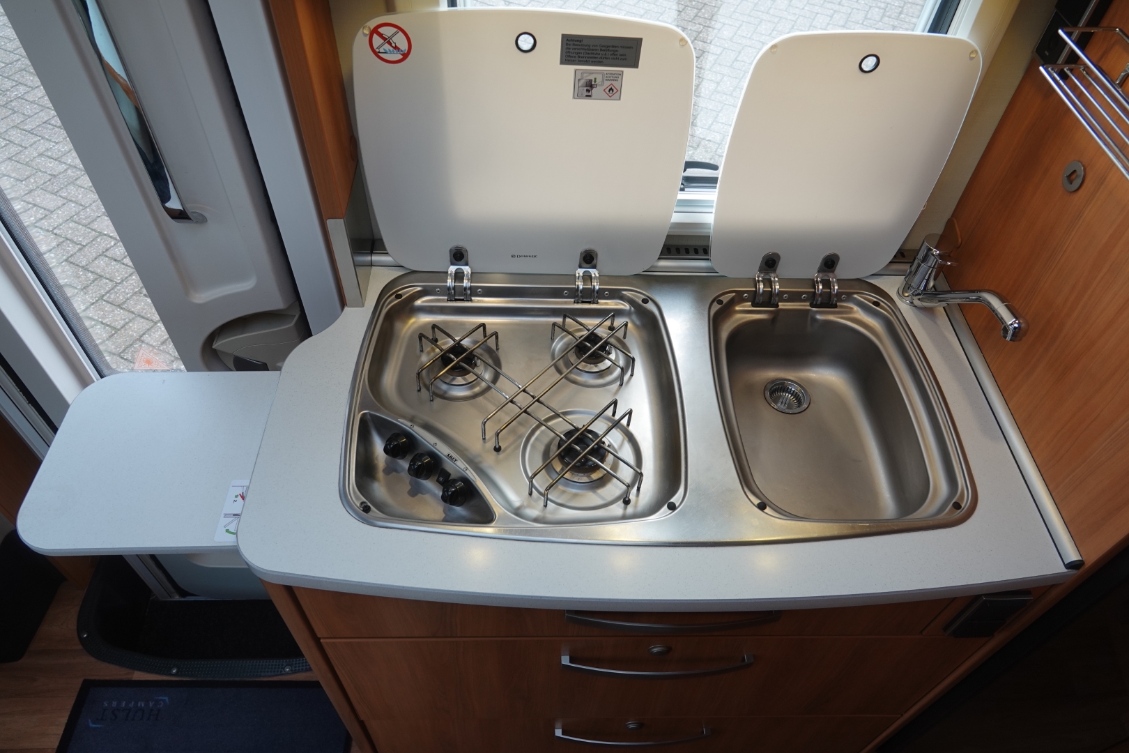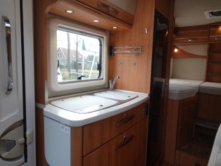 De royale keuken heeft een luxe keukenblad met spoelbak en 3 pits kooktoestel met automatische ontsteking, diverse gelagerde laden met verrassend veel bergruimte voor het kookgerei en boodschappen, grote Thetford koelkast met aparte vriezer, en automatische energiekeuze.