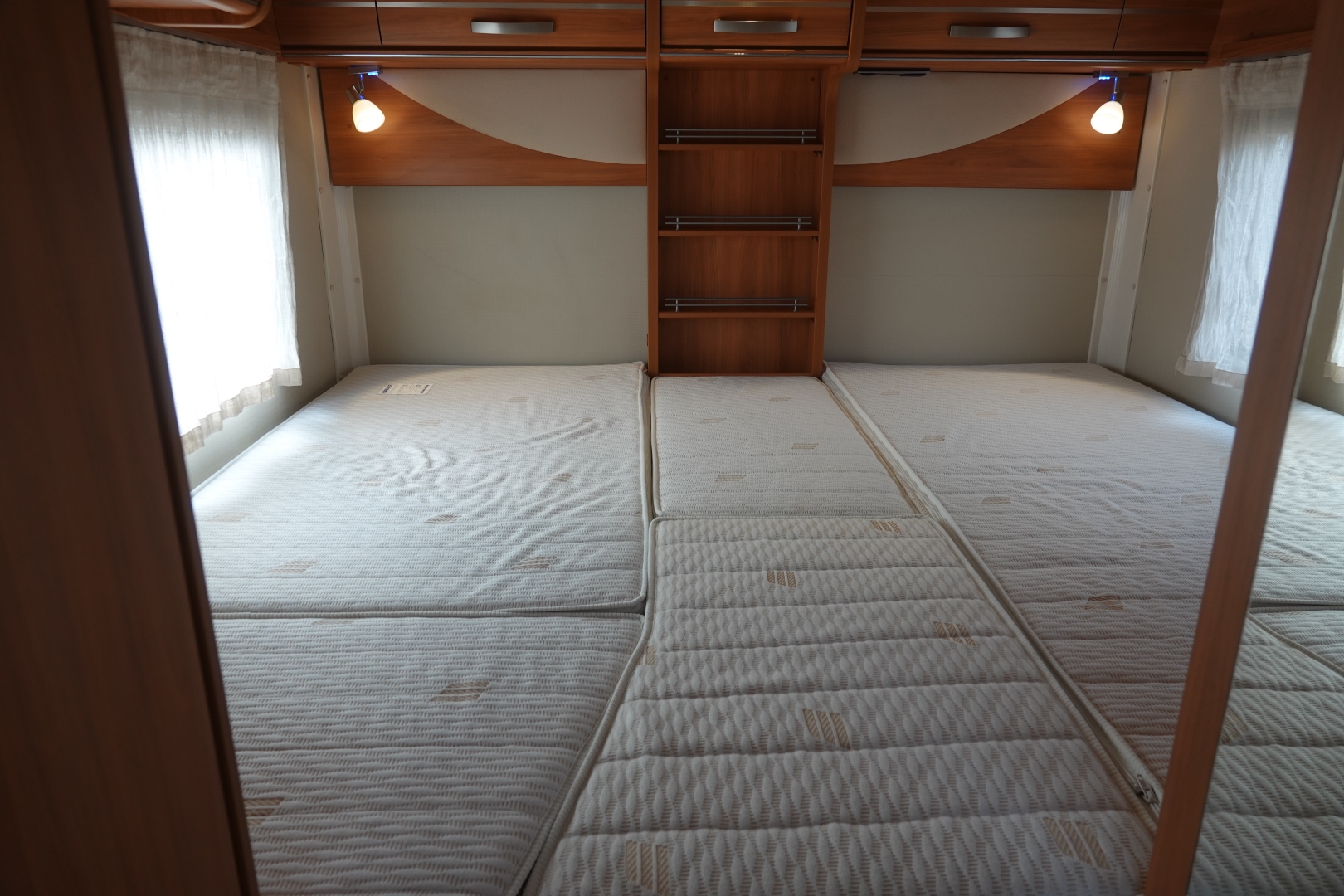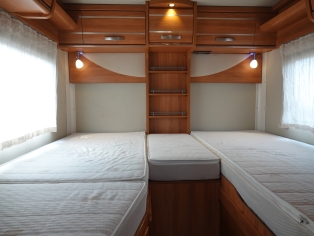 Het slaapgedeelte achterin heeft 2 lage enkele bedden met traagschuim matras op schotelsysteem voor optimaal slaapcomfort.