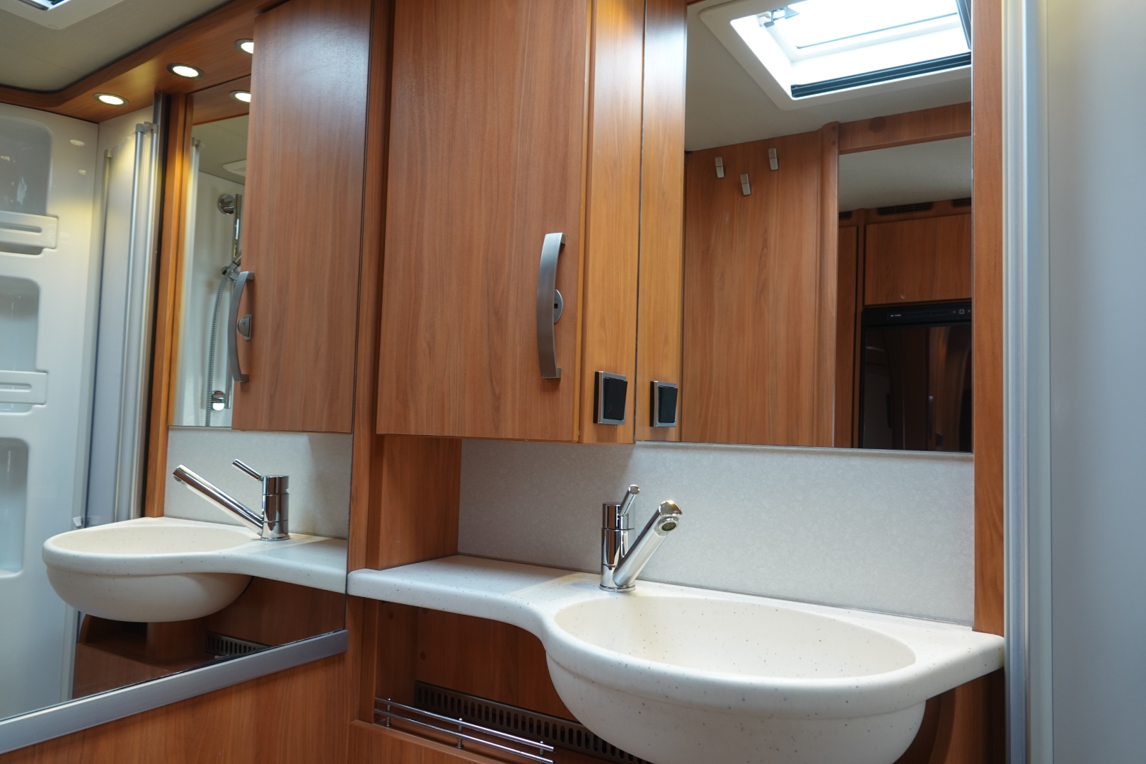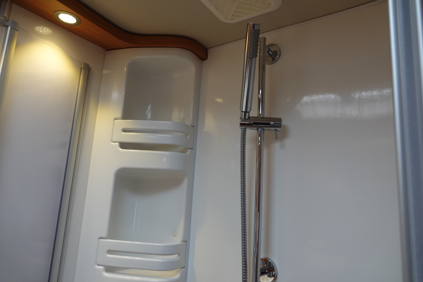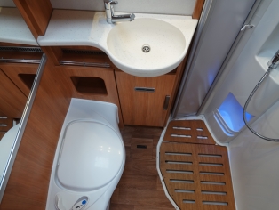 De ruime badkamer met wastafel heeft een Thetford toilet met SOG, extra kastruimte en een aparte grote douchecabine.