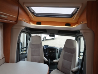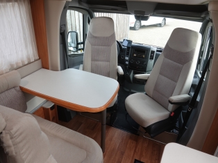2 comfortabele pilotestoelen in hoogte verstelbaar, draaibaar naar een gezellige zitgroep met luxe salontafel en groot panoramadak er boven.