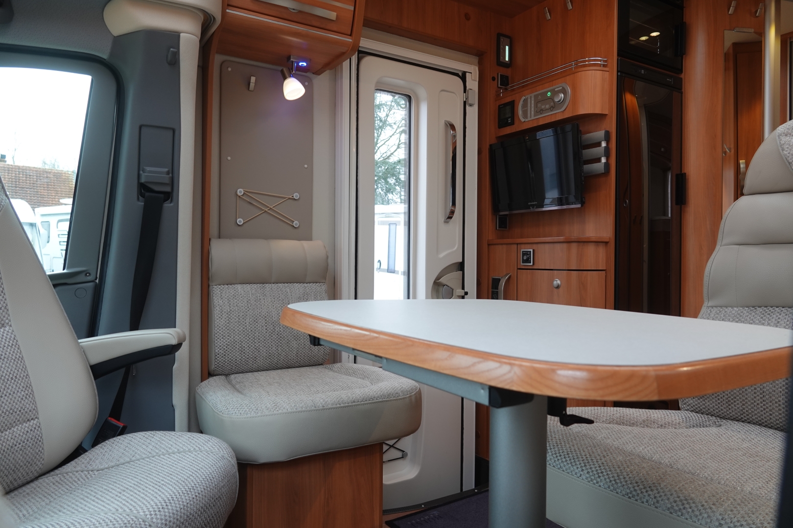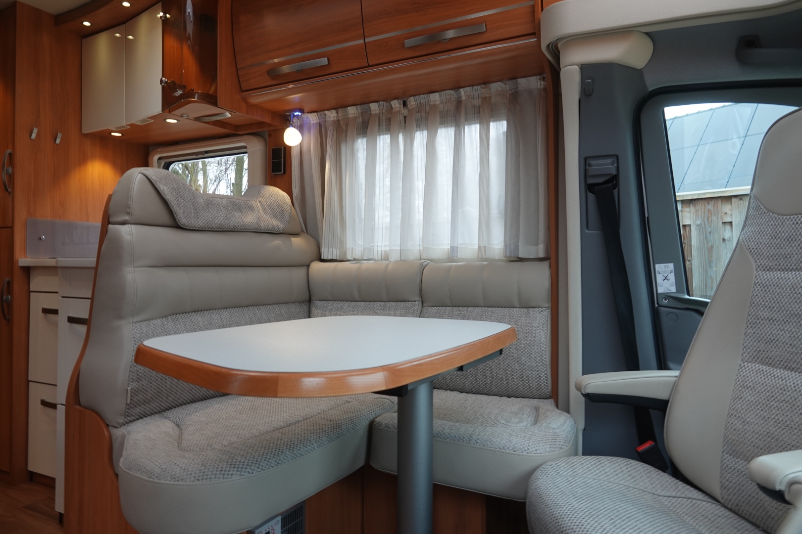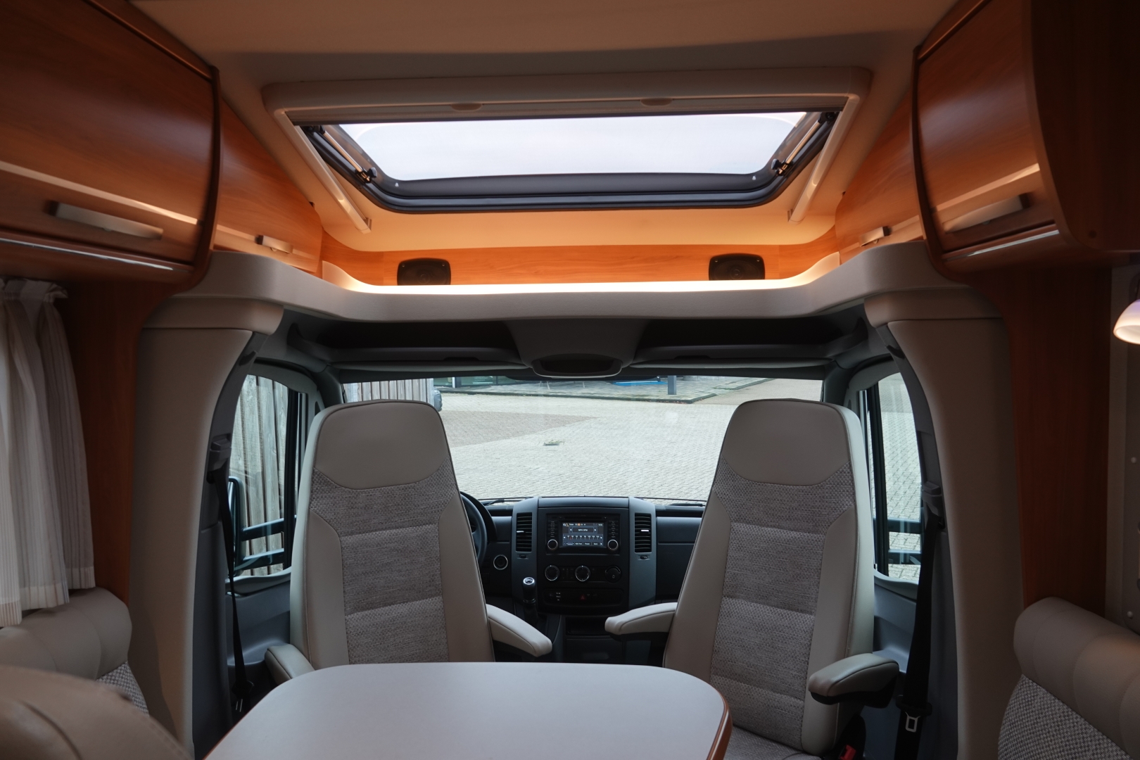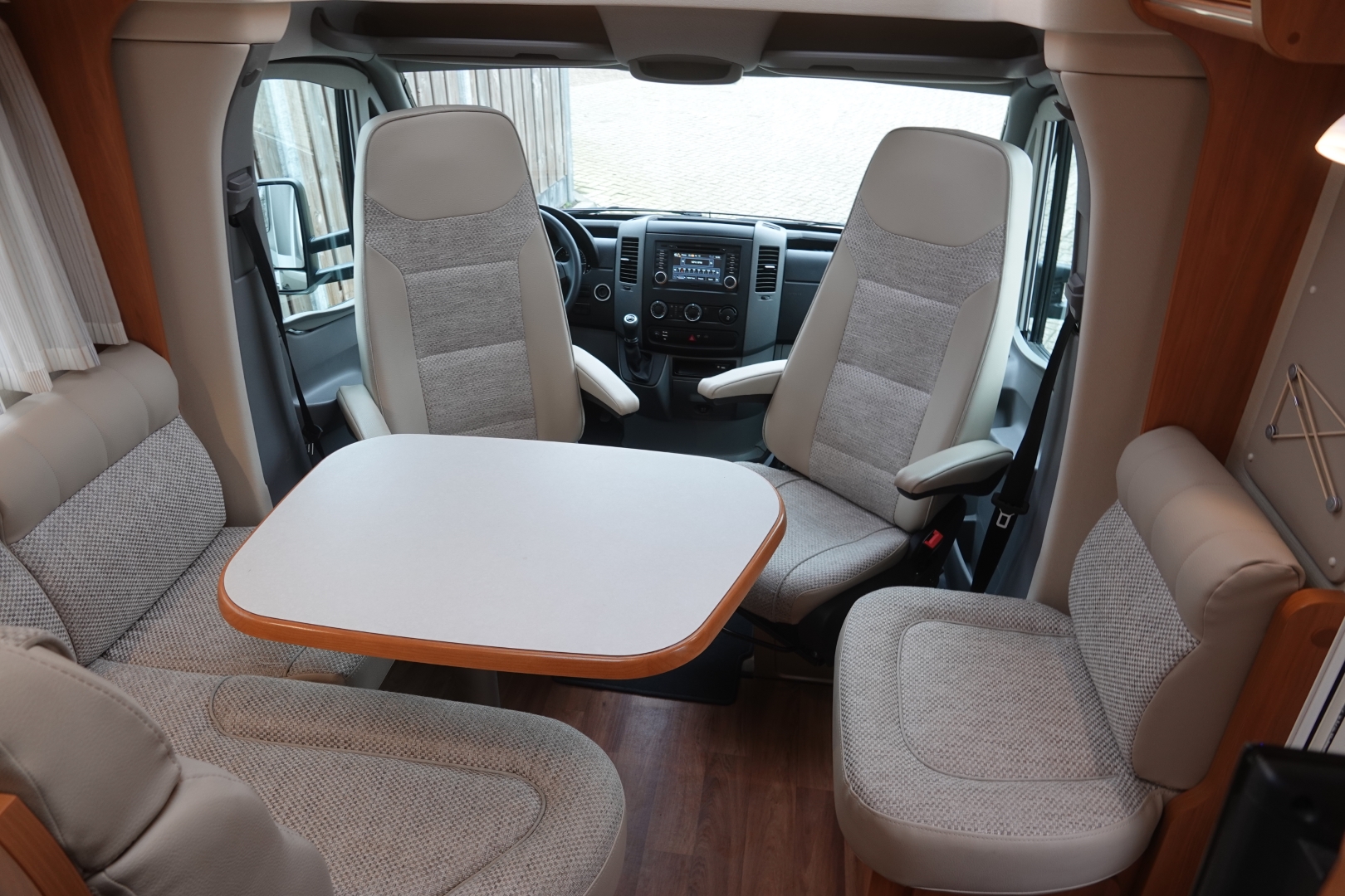 2 comfortabele pilotestoelen in hoogte verstelbaar, draaibaar naar een gezellige zitgroep met luxe salontafel en groot panoramadak er boven.