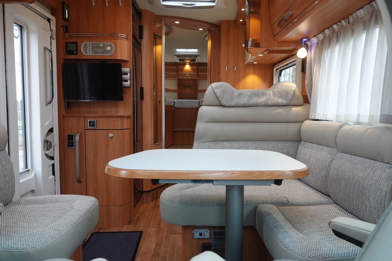 Het interieur bestaat uit het Hymer Trentino Birnbaum meubeldecor met de luxe Cremissimo bekleding wat met de LED verlichting een bijzondere sfeer geeft. Alle ramen zijn voorzien van vouwverduistering.