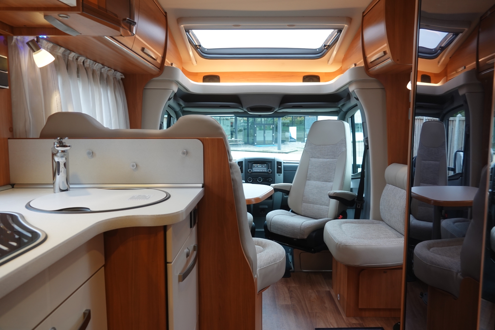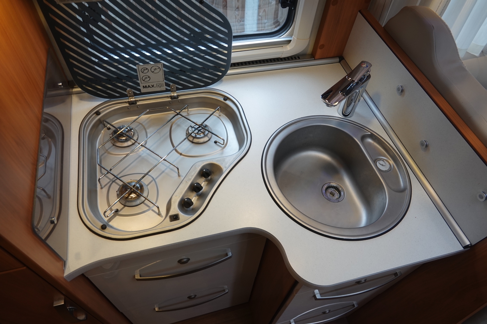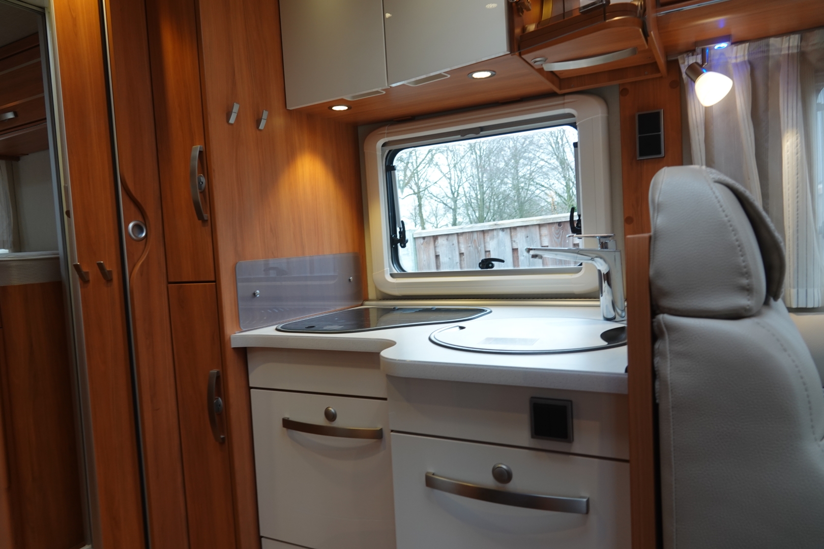De royale keuken heeft een luxe keukenblad met spoelbak en 3 pits kooktoestel met automatische ontsteking, diverse gelagerde laden met verrassend veel bergruimte voor het kookgerei en boodschappen, grote Thetford koelkast met aparte vriezer, en automatische energiekeuze en luxe oven.