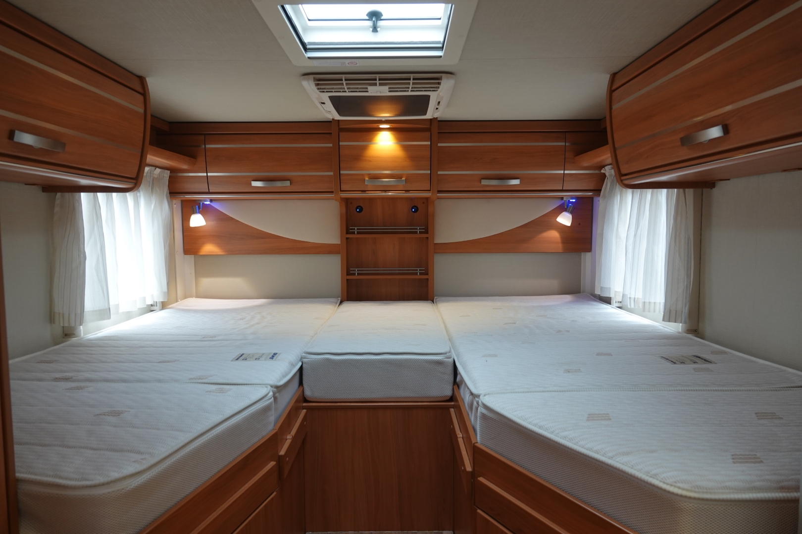 Het slaapgedeelte achterin heeft 2 lengte bedden (dicht te leggen tot eén groot bed) met traagschuim matras voor optimaal slaapcomfort. Het interieur is heerlijk koel te houden met de dak airco.