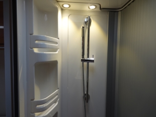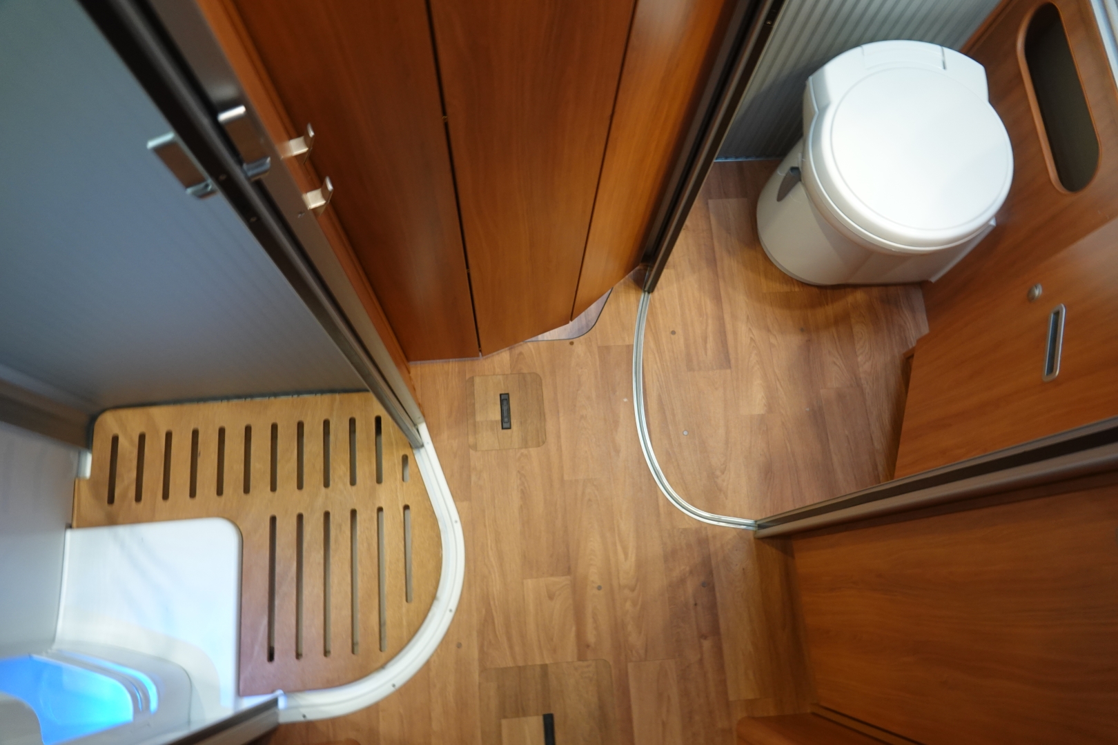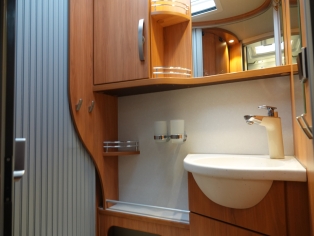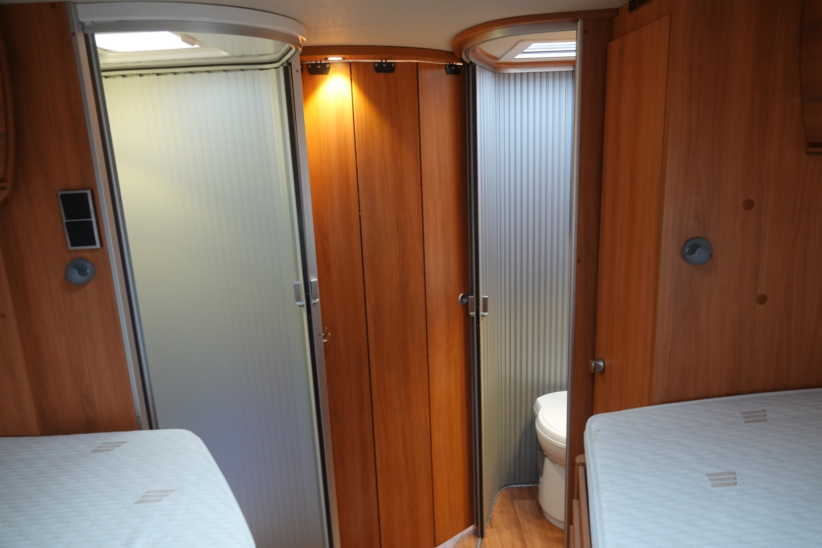 De ruime badkamer met wastafel heeft een Thetford toilet met SOG, extra kastruimte en er tegenover een aparte grote douchecabine. De slaapkamer met sanitaire ruimte is geheel afsluitbaar dmv. een schuifdeur.