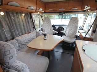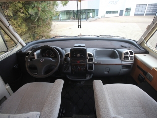 2 comfortabele pilotestoelen draaibaar naar gezellige comfort-zit. Het interieur bestaat uit de unieke Hymer Lyon stof bekleding en schitterend Kirschbaum interieur, wat met zijn vele sfeerverlichting een bijzonder mooi effect geeft. Schitterende bovenkastjes in cabine waar u rechtop kunt staan. Alle ramen zijn voorzien van plissévouwverduistering.