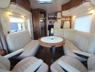 2 comfortabele met leer beklede pilotestoelen, draaibaar naar een ruime en gezellige comfort L-zit met lange zijbank en luxe uitschuifbare salontafel. Het interieur bestaat uit de unieke Hymer stijl Noce Bergoma in combinatie met zeer chique leren bekleding, wat met zijn vele ambiente verlichting een bijzonder mooie sfeer geeft. Alle ramen zijn voorzien van plissé vouwverduistering.