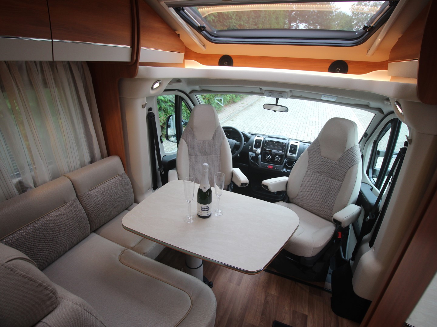 2 comfortabele pilotestoelen draaibaar naar gezellige en comfortabele zitgroep, met een groot panoramadakluik erboven. Het interieur bestaat uit de Hymer woonruimte-concept Modern Living in combinatie met chique leder/stofbekleding. De vele LED verlichting maakt de sfeer compleet. Van de zitgroep is eenvoudig een extra bed te maken. Het interieur heeft een volledig vlakke vloer. Alle ramen zijn voorzien van plissévouwverduistering.