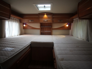 Het slaap gedeelte heeft achter 2 lengtebedden, dicht te leggen naar 1 groot bed, op het Hymer slaapcomfortsysteem.