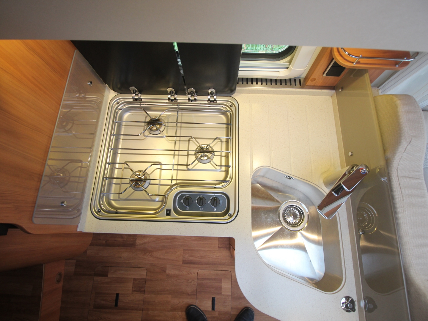 De royale hoekkeuken heeft een luxe keukenblad met spoelbak en 3 pits kooktoestel met automatische ontsteking, diverse gelagerde laden met verrassend veel bergruimte voor het kookgerei en boodschappen, grote Thetford koelkast met ruim vriesvak, en automatische omschakeling van energiekeuze.