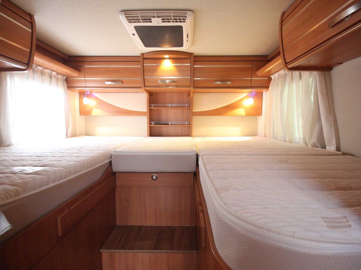 Het slaap gedeelte heeft achter 2 lengtebedden, dicht te leggen naar 1 groot bed, op het Hymer slaapcomfortsysteem.