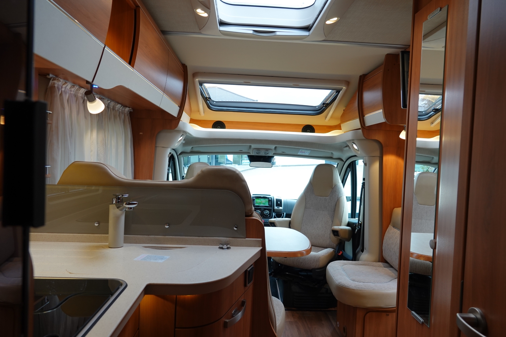 2 comfortabele pilotestoelen, in hoogte verstelbaar en kantelbaar, draaibaar naar gezellige en comfortabele zitgroep, met een groot panoramadak erboven. Het interieur heeft een volledig vlakke vloer en bestaat uit het Hymer woonruimte-concept Modern Living in combinatie met chique Santana bekleding, wat met de vele LED sfeer-verlichting een bijzonder mooi effect geeft. Alle ramen zijn voorzien van plissévouwverduistering.