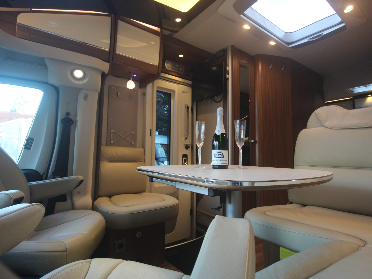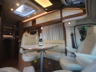 2 comfortabele pilotestoelen, in hoogte verstelbaar en kantelbaar, draaibaar naar gezellige en comfortabele zitgroep, met een groot panoramadak erboven. Het interieur heeft een volledig vlakke vloer en bestaat uit het Hymer woonruimte-concept Modern Living in combinatie met chique leren bekleding, wat met de vele LED sfeer-verlichting een bijzonder mooi effect geeft. Alle ramen zijn voorzien van plissévouwverduistering.