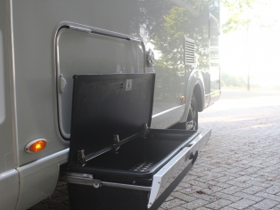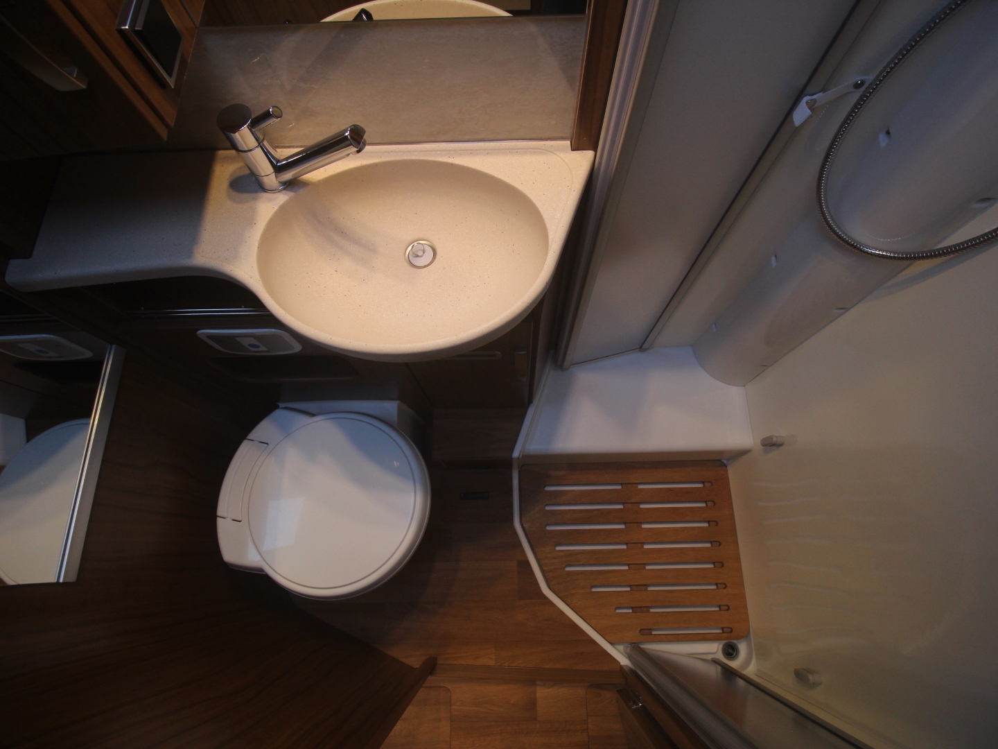 Luxe comfortabele badkamer met wastafel en Thetford toilet met extra kastruimte en ruime aparte douchecabine, SOG automatische toiletontluchting. De schoonwatertank 120 L en vuilwatertank 100 L bevinden zich in de (verwarmde) dubbele vloer.