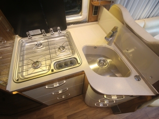 De royale hoekkeuken heeft een luxe keukenblad met spoelbak en 3 pits kooktoestel met automatische ontsteking, diverse gelagerde laden met verrassend veel bergruimte voor het kookgerei en boodschappen, ruime koelkast met aparte vriezer, en automatische omschakeling van 220V / 12V / gas.