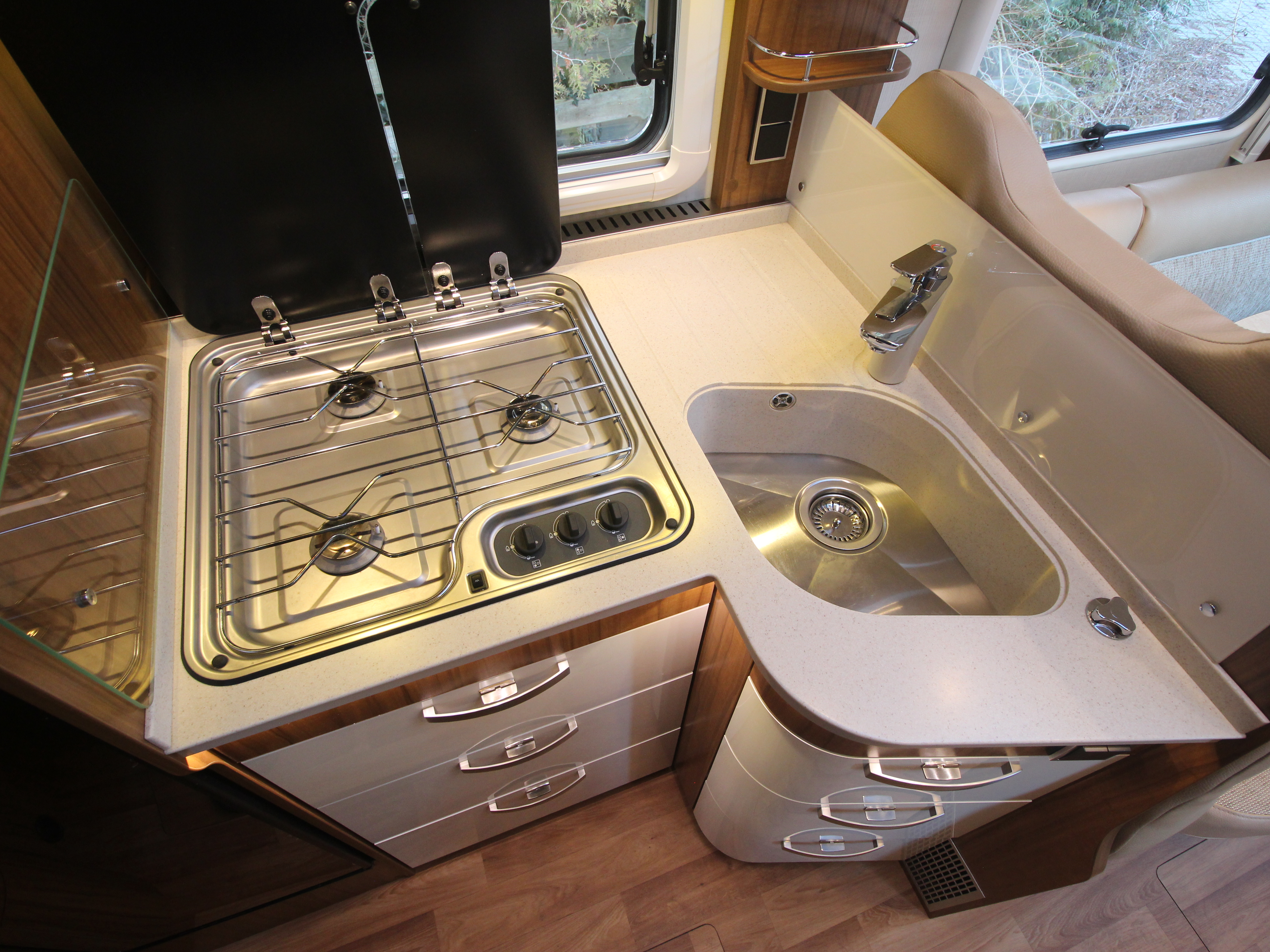 De royale hoekkeuken heeft een luxe keukenblad met spoelbak en 3 pits kooktoestel met automatische ontsteking, diverse gelagerde laden met verrassend veel bergruimte voor het kookgerei en boodschappen, ruime koelkast met aparte vriezer, en automatische omschakeling van 220V / 12V / gas.