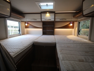 Het slaap gedeelte heeft achter 2 enkele bedden, dicht te leggen naar een groot bed met het Hymer slaapcomfort systeem, waaronder zich 2 ruime (hang)kasten bevinden.