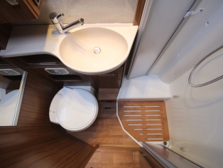 Luxe comfortabele badkamer met wastafel en Thetford toilet met extra kastruimte en ruime aparte douchecabine, SOG automatische toiletontluchting. De schoonwatertank 120 L en vuilwatertank 100 L bevinden zich in de (verwarmde) dubbele vloer.