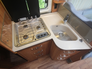 De royale hoekkeuken heeft een luxe keukenblad van mineraalstof met spoelbak en 3 pits kooktoestel met automatische ontsteking, diverse gelagerde laden met verrassend veel bergruimte voor het kookgerei en boodschappen, Thetford Smart Tower koelkast 142 ltr met vriesvak, en automatische omschakeling van 220 V/12 V/gas.
