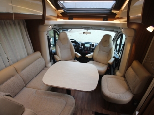 2 comfortabele pilotestoelen, in hoogte verstelbaar en kantelbaar, draaibaar naar gezellige en comfortabele zitgroep, met een groot panoramadak erboven. Het interieur heeft een volledig vlakke vloer en bestaat uit het Hymer woonruimte-concept Modern Living in combinatie met chique stoffen bekleding, wat met de vele LED sfeer-verlichting een bijzonder mooi effect geeft. Alle ramen zijn voorzien van plissévouwverduistering.