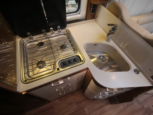 De royale hoekkeuken heeft een luxe keukenblad met spoelbak en 3 pits kooktoestel met automatische ontsteking, diverse gelagerde laden met verrassend veel bergruimte voor het kookgerei en boodschappen, ruime koelkast met aparte vriezer, en automatische omschakeling van 220V / 12V / gas.