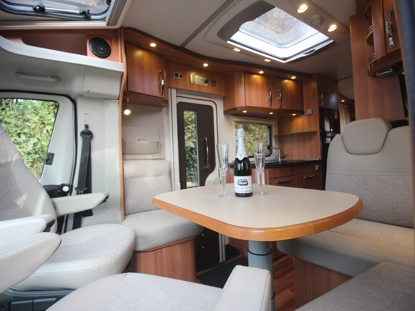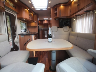 2 comfortabele pilotestoelen, in hoogte verstelbaar en kantelbaar, draaibaar naar gezellige en comfortabele zitgroep, met een groot panoramadak erboven. Het interieur bestaat uit het Hymer meubeldecor in combinatie met chique leder/stof bekleding, wat met de vele LED sfeer-verlichting een bijzonder mooi effect geeft. Alle ramen zijn voorzien van plissé vouwverduistering.