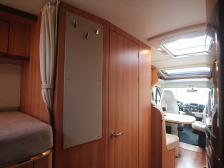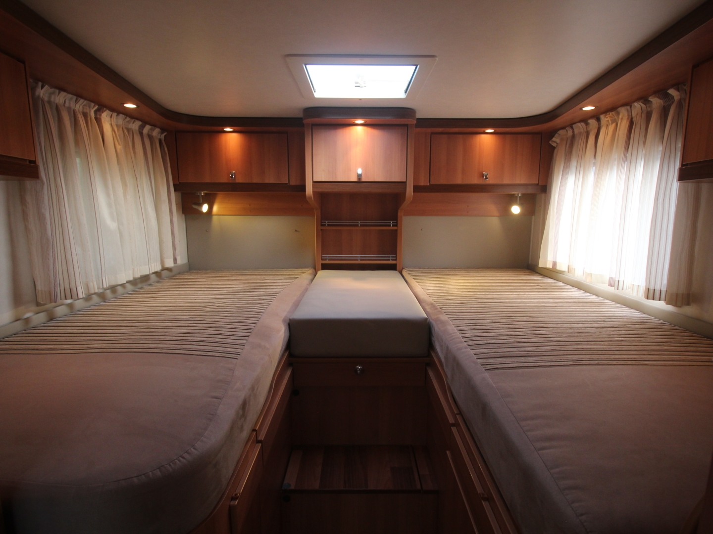 Het slaap gedeelte heeft achter 2 enkele bedden (dicht te leggen tot 1 groot bed) met binnenveringsmatras op lattenbodem, waaronder zich 2 ruime (hang)kasten bevinden.