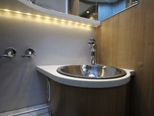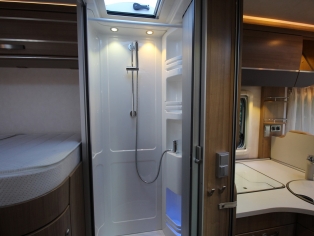 Links achterin bevind zich de ruime douchecabine, en er tegenover het toilet Thetford met SOG automatische toilet ontluchting en extra kastruimte. De schoonwatertank en vuilwatertank zijn geïsoleerd en verwarmbaar in de vloer weggewerkt.