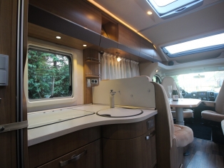 De royale hoekkeuken heeft een luxe keukenblad met spoelbak en 3 pits kooktoestel met automatische ontsteking, diverse gelagerde laden met verrassend veel bergruimte voor het kookgerei en boodschappen, grote dubbeldeurs koelkast met aparte vriezer, en automatische omschakeling van 220 V/12 V/gas.