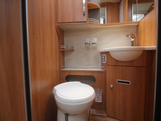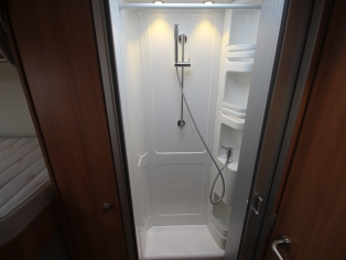 Links achterin bevind zich de ruime douchecabine, en er tegenover het toilet Thetford met SOG automatische toilet ontluchting en extra kastruimte. De schoonwatertank en vuilwatertank zijn geïsoleerd en verwarmbaar in de vloer weggewerkt.
