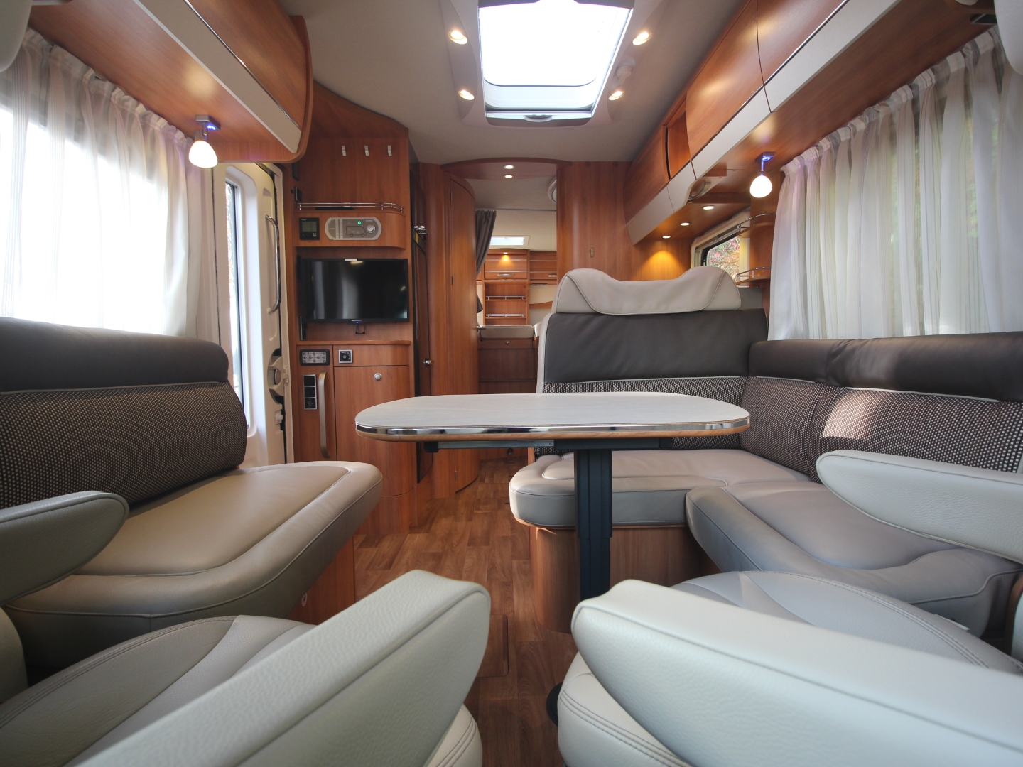 2 comfortabele pilotestoelen draaibaar naar gezellige en comfortabele zitgroep, met lange zijbank en een groot panoramadakluik erboven. Het interieur bestaat uit de Hymer woonruimte-concept Trentino birnbaum in combinatie met chique Tabago leder/stofbekleding. De vele LED verlichting maakt de sfeer compleet. Het betreft een SL serie met een volledig vlakke vloer en veel bergruimte bereikbaar via luiken in de vloer. Alle ramen zijn voorzien van plissévouwverduistering.