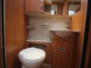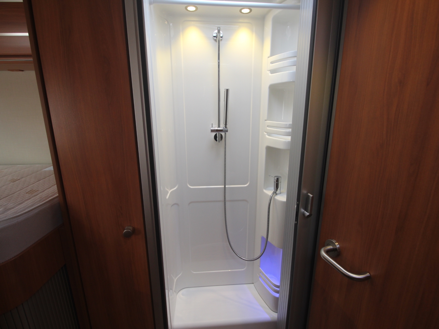 Links achterin bevind zich de ruime douchecabine, en er tegenover het toilet Thetford met SOG automatische toilet ontluchting en extra kastruimte. De schoonwatertank en vuilwatertank zijn geïsoleerd en verwarmbaar in de vloer weggewerkt.