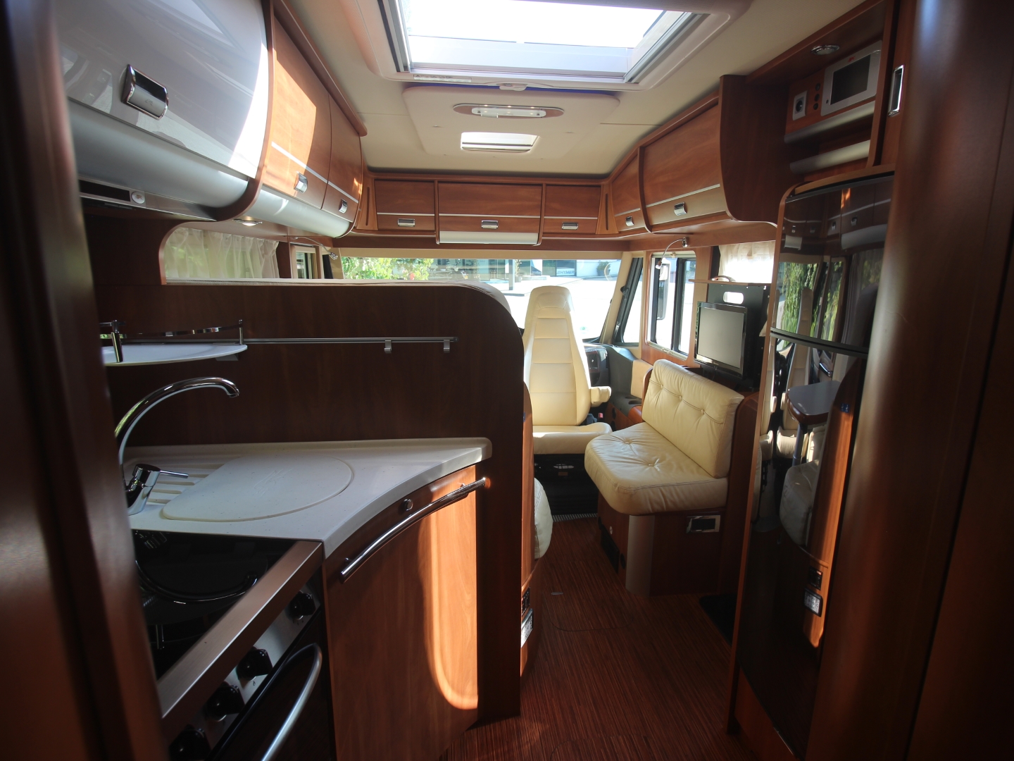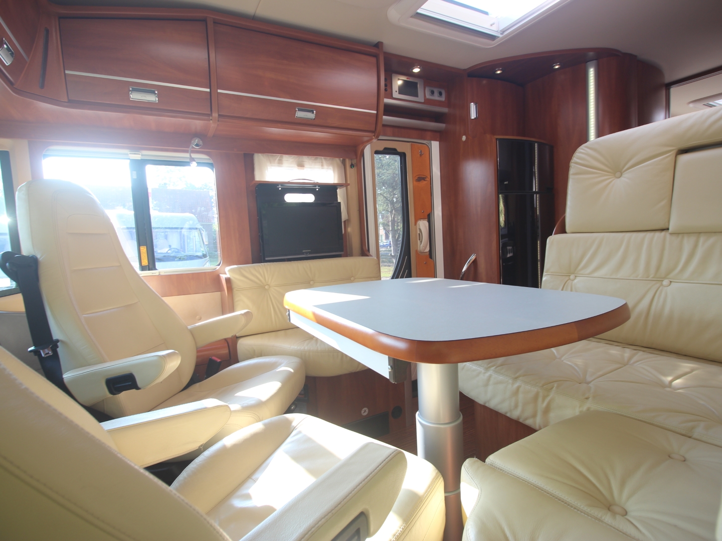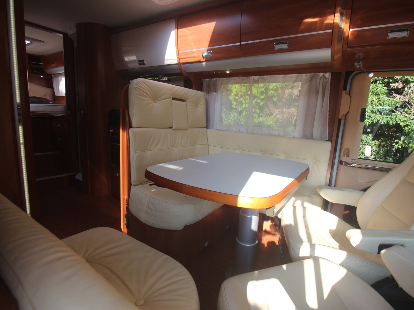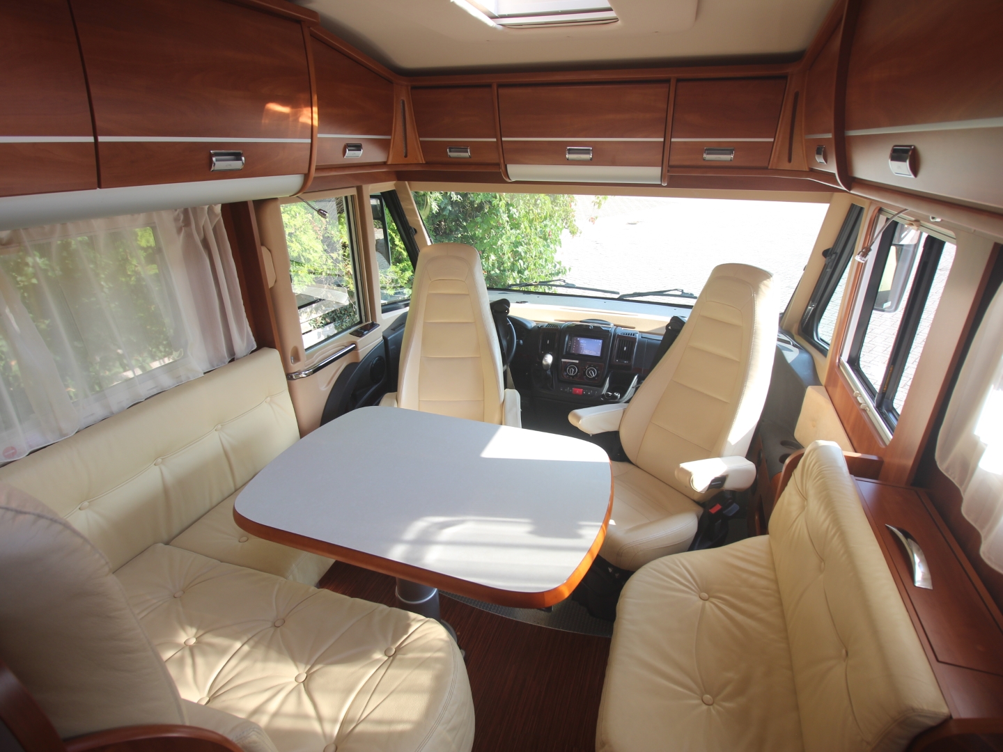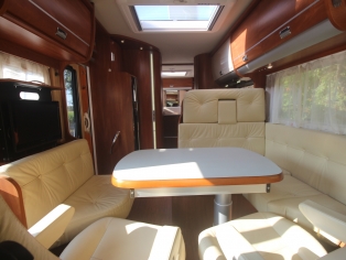 2 comfortabele met leer beklede Aguti pilotestoelen, in hoogte verstelbaar en kantelbaar, draaibaar naar een gezellig comfort L-zit. Het interieur bestaat uit exclusief meubeldecor in combinatie met de luxe leder bekleding, waarbij met de vele LED verlichting een bijzondere sfeer ontstaat. Schitterende bovenkastjes in cabine waar u rechtop kunt staan. De comfort ingangs-deur is voorzien van een raam, schuifbare hor, en elektrische opstap. Alle ramen zijn voorzien van vouwverduistering.