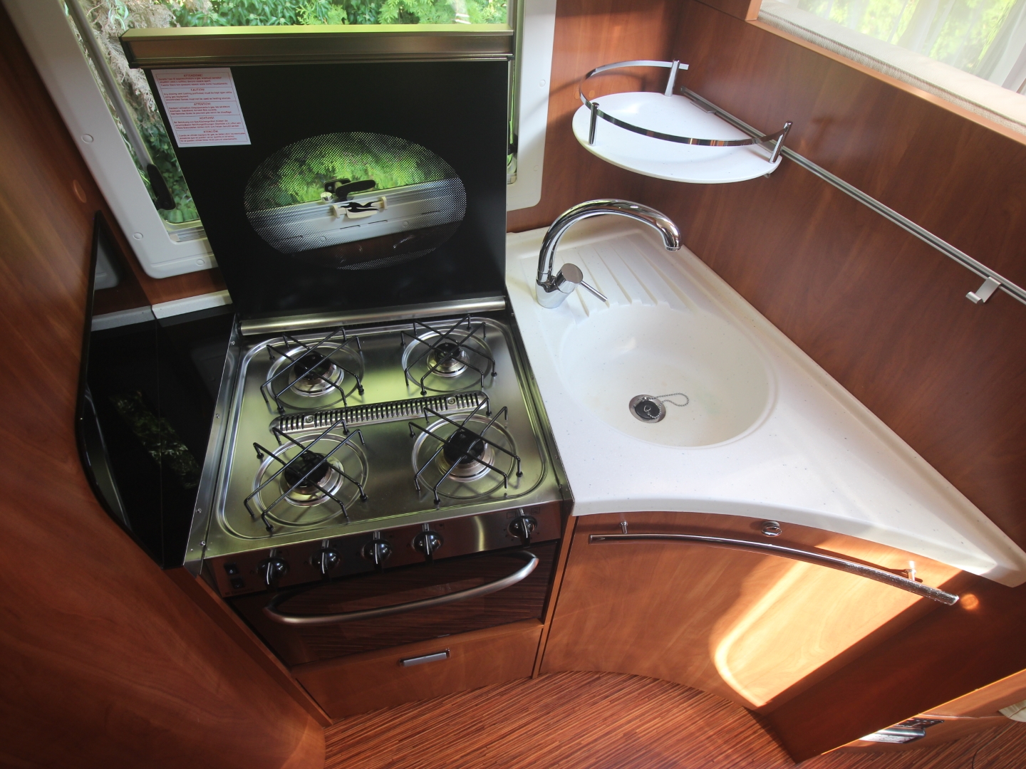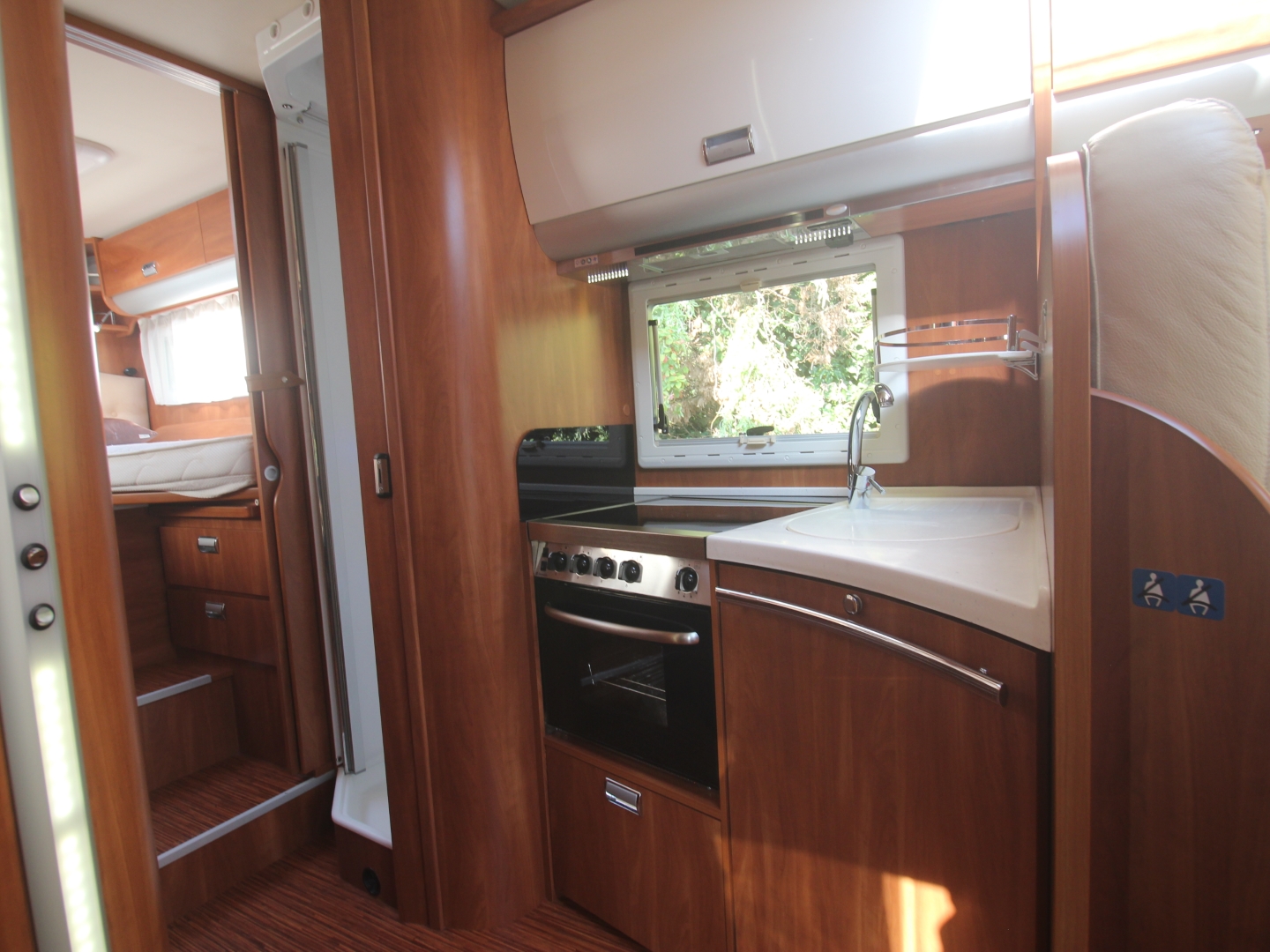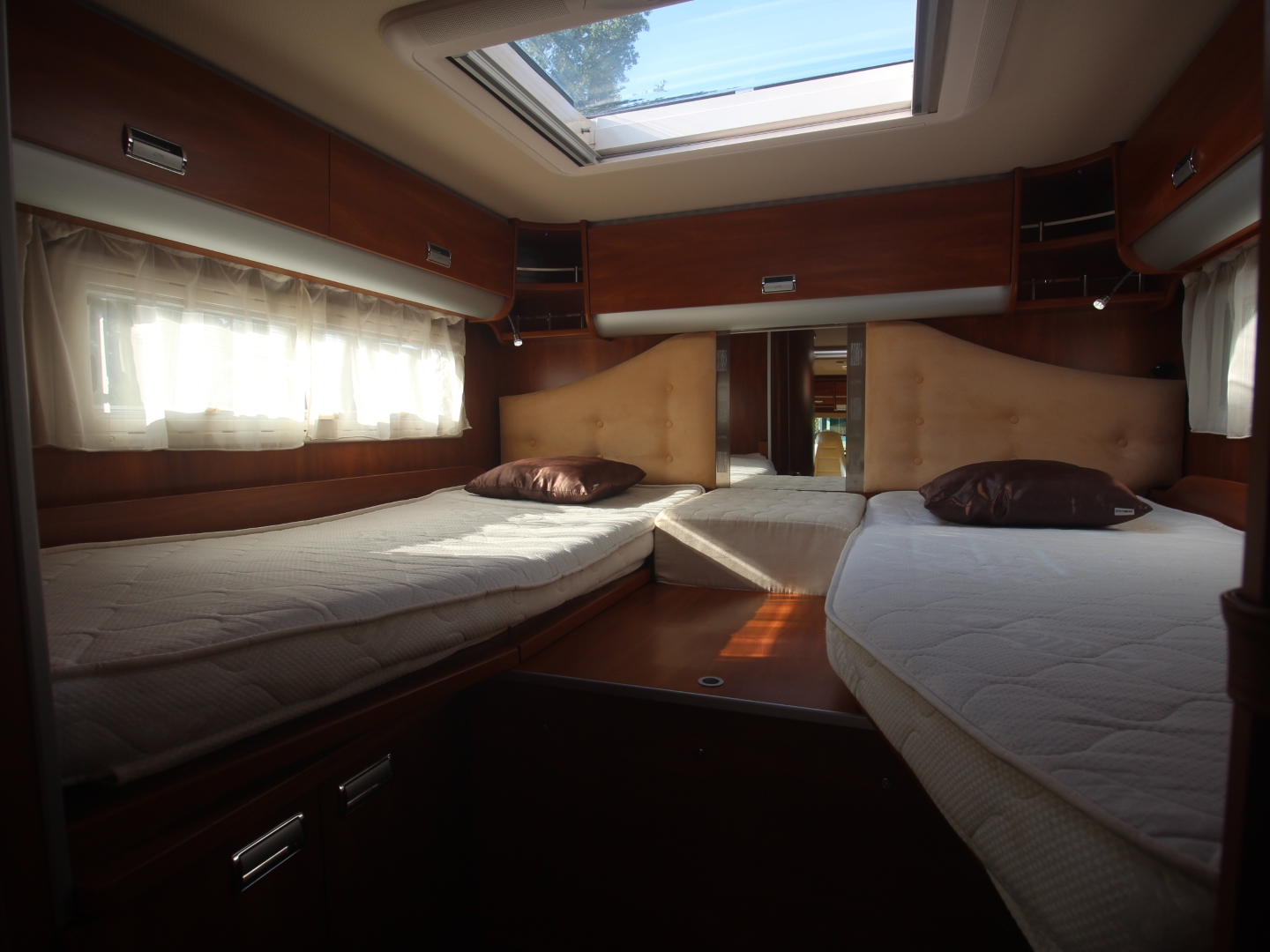 Het slaapgedeelte heeft 2 enkele bedden met binnenvering matras op lattenbodem, ( om te leggen naar 1 groot bed) waaronder zich 2 ruime (hang)kasten bevinden. Dit betreft een Laika 7000 serie en bevat een dubbele bodem met veel extra bergruimte bereikbaar door diverse luiken in de vloer. De camper is voorzien van het Truma Combi E verwarming systeem met als gas of elektra als energiekeuze. De royale hoekkeuken bevat een spoelbak en 4 pits kooktoestel, luxe oven, diverse gelagerde laden met verrassend veel bergruimte voor kookgerei en boodschappen, en Dometic Tec Tower koelkast met aparte vriezer.