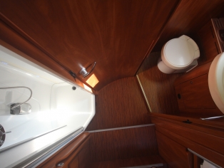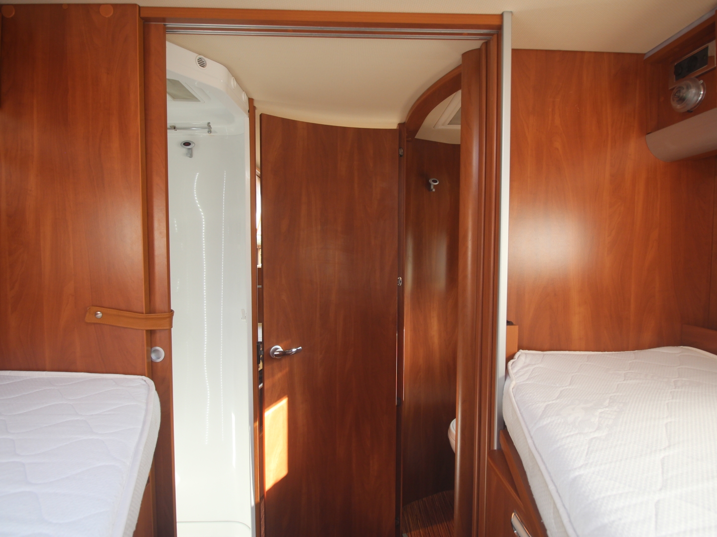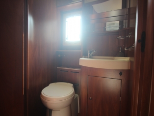 Links achterin bevind zich de ruime aparte douchecabine, en er tegenover het toilet Thetford met SOG automatische toilet ontluchting en extra kastruimte.