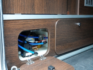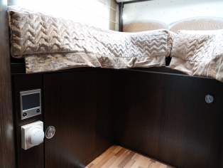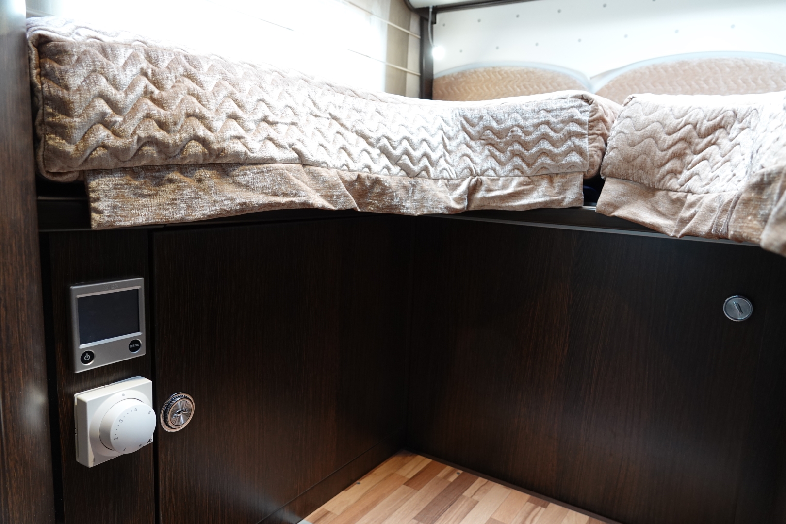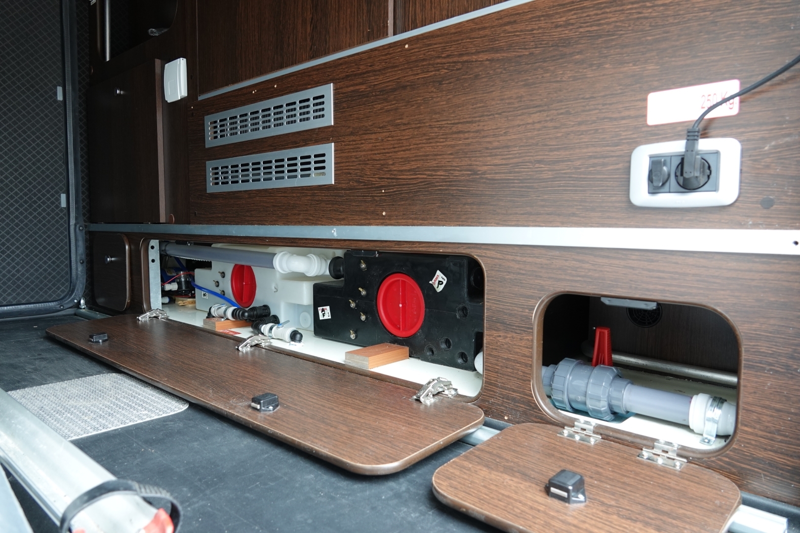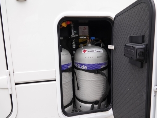 De camper heeft veel bergruimte in de ruime dubbele bodem bereikbaar dmv. verschillende luiken in de vloer en diverse kleppen buitenkant. Het bevat tevens een grote garage, met aan beide zijden een grote deur, waarin uw fietsen en bagage veilig binnen geplaatst kunnen worden. De schoon- en vuilwatertank bevinden zich in de (verwarmde) dubbele vloer.