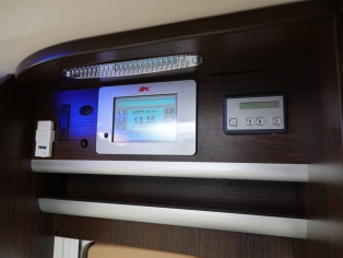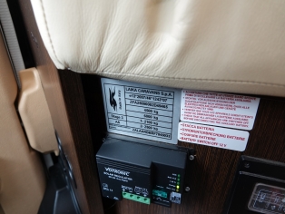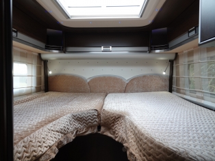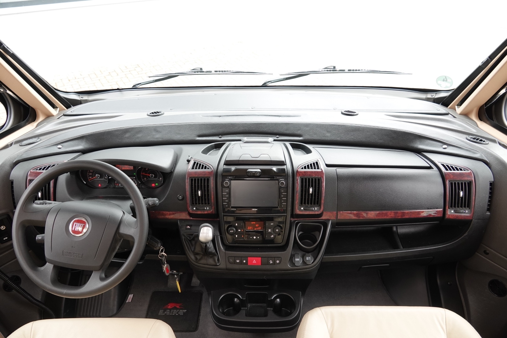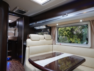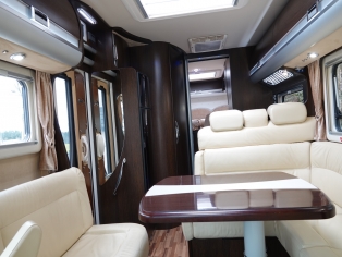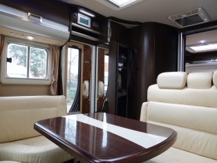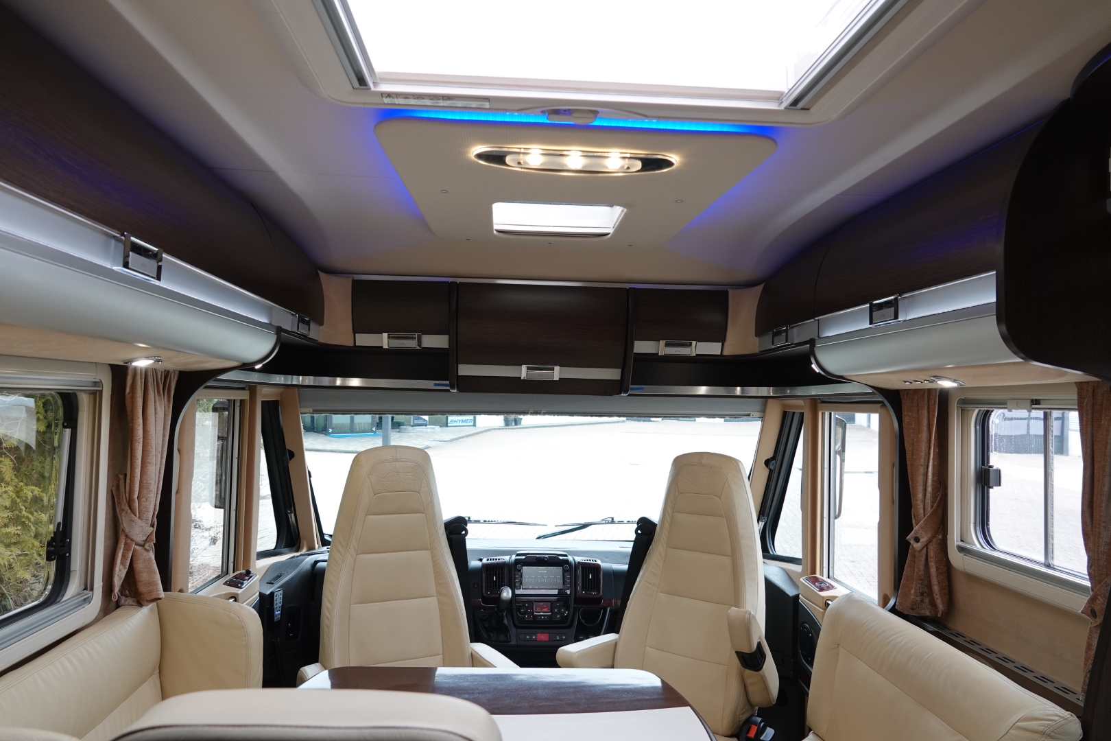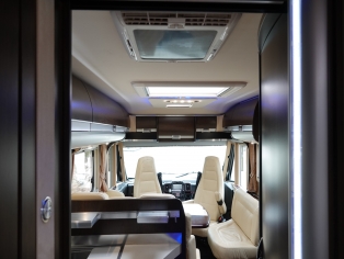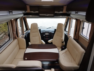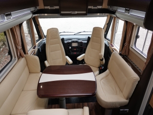 2 comfortabele, met leer beklede, Aguti Ergoflex pilotenstoelen in hoogte verstelbaar en kantelbaar, draaibaar naar een gezellige comfort L-zit met luxe salontafel. Het interieur bestaat uit het Yacht meubeldesign met de luxe lederen bekleding wat in combinatie met de vele (indirecte) LED verlichting een bijzondere sfeer geeft. Het geheel word verwarmd door het comfortabele ALDE 3020 HE vloeistof-verwarming. Cabineramen zijn voorzien van plisséverduistering.