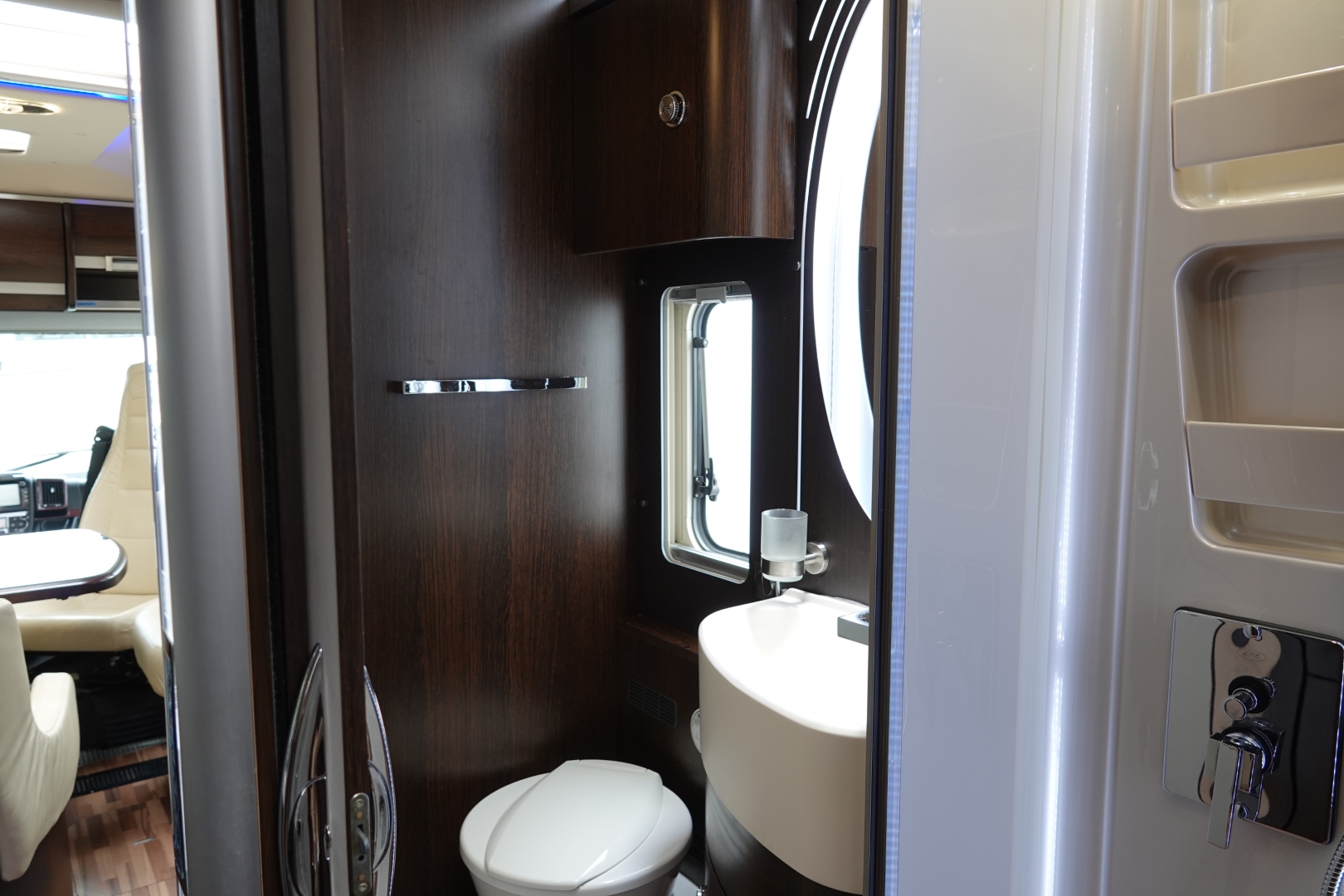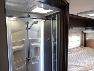 Links achterin bevind zich de ruime douchecabine, en er tegenover het keramisch toilet Thetford met extra kastruimte.