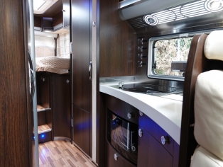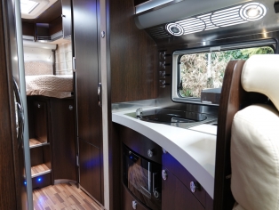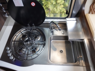 De royale keuken heeft een luxe keukenblad met spoelbak en 4 pits kooktoestel met automatische ontsteking, afzuigkap, diverse gelagerde laden met verrassend veel bergruimte voor het kookgerei en boodschappen, grote Dometic dubbeldeurs koelkast 160 ltr met aparte vriezer, oven en automatische omschakeling van 220 V/12 V/gas