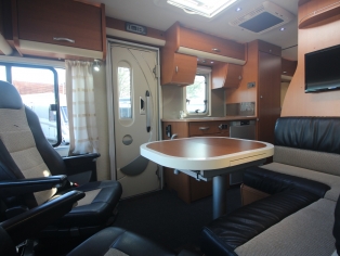 2 comfortabele Aguti Ergoflex pilotestoelen in hoogte verstelbaar en kantelbaar, draaibaar naar een gezellige comfort L-zit met luxe uitschuifbare salontafel. Het interieur bestaat uit het stijlvolle Kirschbaum houtdecor met de luxe leer/stof bekleding wat samen met de vele LED verlichting een bijzondere sfeer geeft. Omdat er bovenkastjes in plaats van een hefbed zijn gemonteerd, is er een bijzonder ruime salon waar u rechtop kunt staan. Cabineramen zijn voorzien van vouw- verduistering. Het voorraam word verduisterd dmv. een elektrisch rolluik. Door middel van de Dometic dakairco is de binnentemperatuur heerlijk koel te houden.