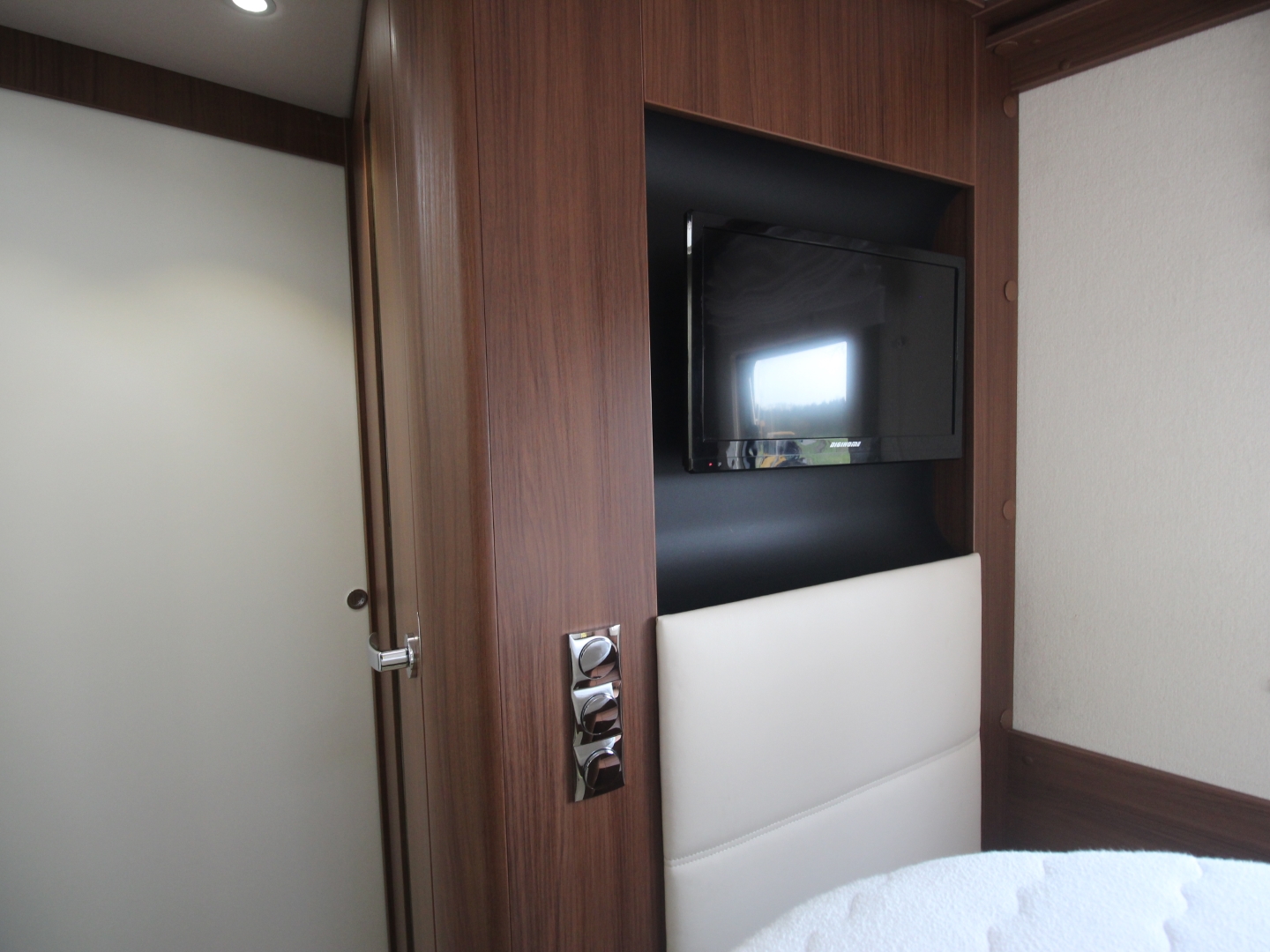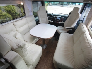 2 comfortabele Isri pilotenstoelen in hoogte verstelbaar en kantelbaar, draaibaar naar een gezellige comfort L-zit met een luxe uitschuifbare salontafel. Het interieur bestaat uit het prachtige notenhouten meubilair in combinatie met uniek Arto Creme lederbekleding, en 'Black Stone' design, wat met de vele LED verlichting en de 'Green Grass' accentverlichting een bijzondere sfeer geeft. Alle ramen zijn voorzien van plissévouwverduistering van hoogwaardige plisséstof, het voorraam word verduistert dmv. een elektrisch rolluik.